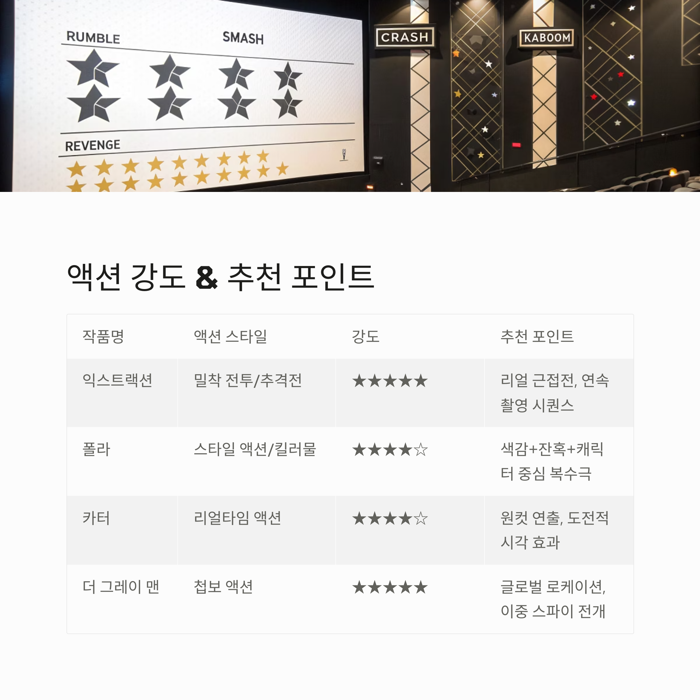작품명 액션 스타일 강도 (5점) 추천 포인트