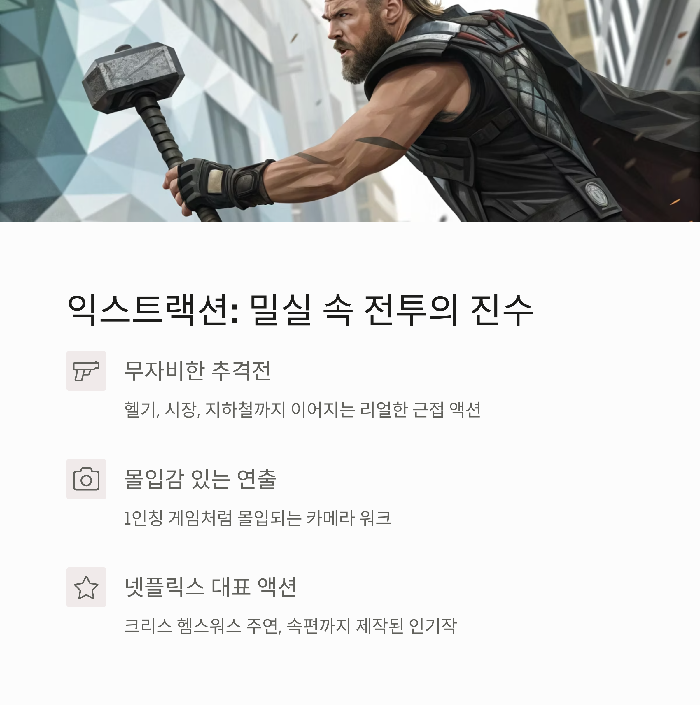 익스트랙션 | 밀착 전투/추격전 | ★★★★★ | 리얼 근접전, 연속 촬영 시퀀스 |
