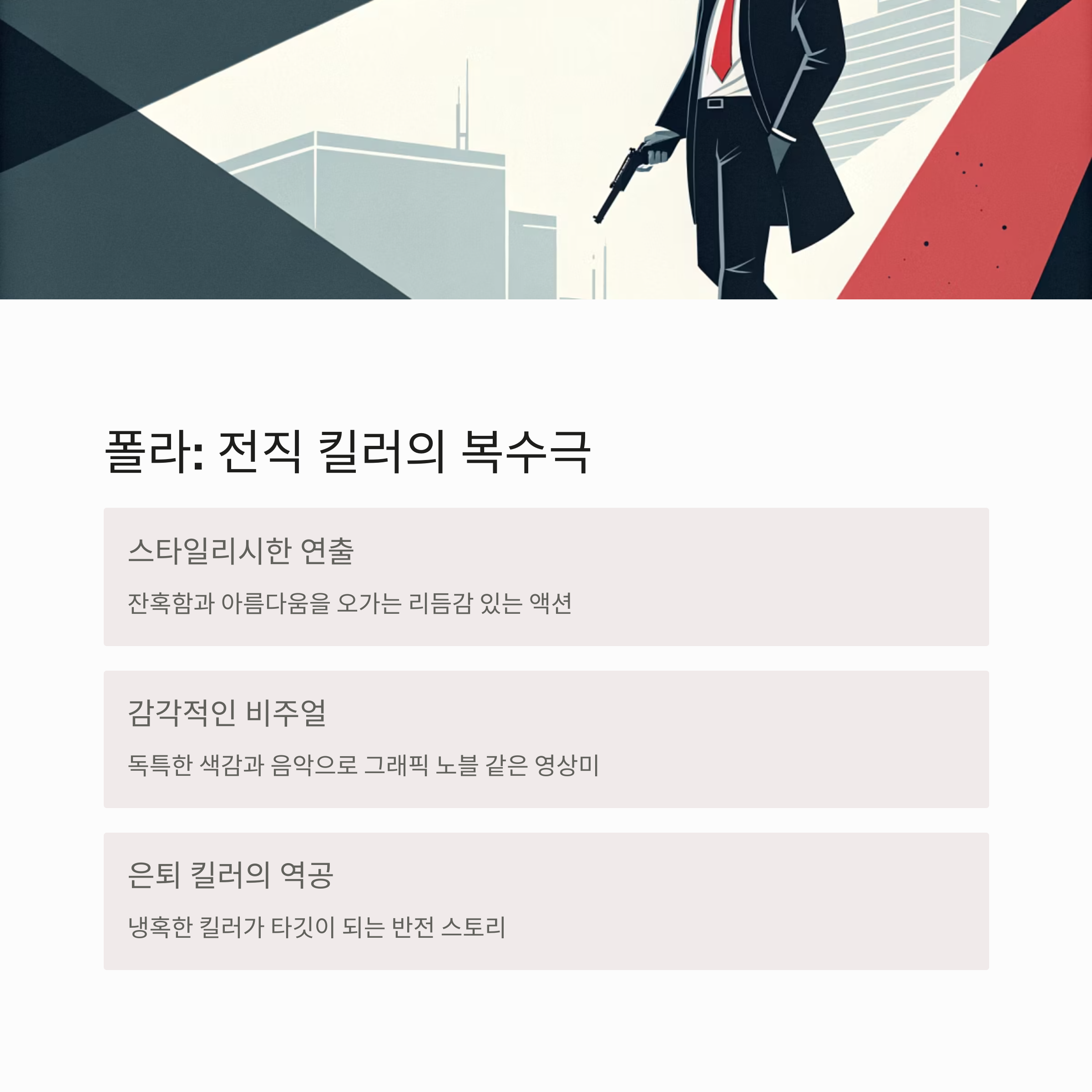 폴라 | 스타일 액션/킬러물 | ★★★★☆ | 색감+잔혹+캐릭터 중심 복수극 |