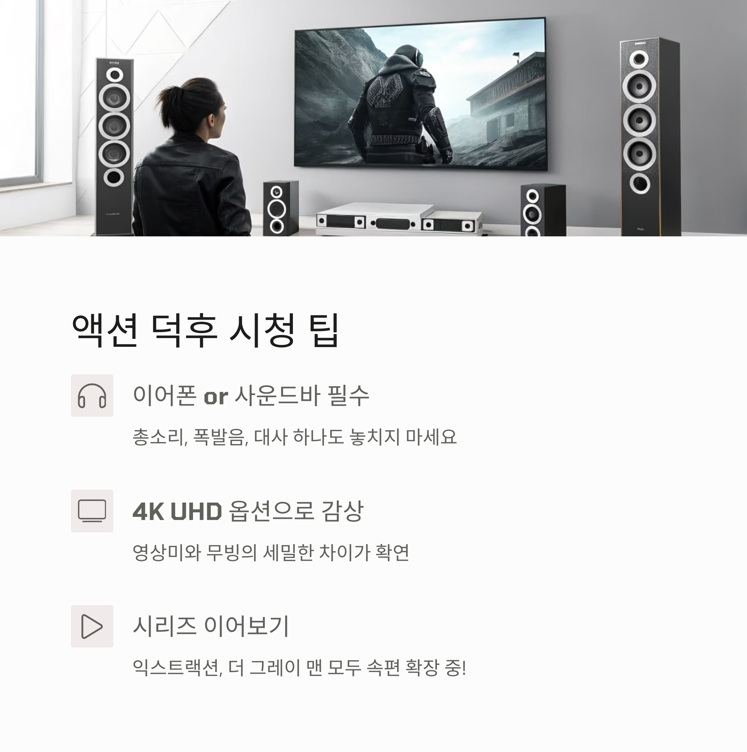 - 이어폰 or 사운드바 필수: 총소리, 폭발음, 대사 하나도 놓치지 마세요