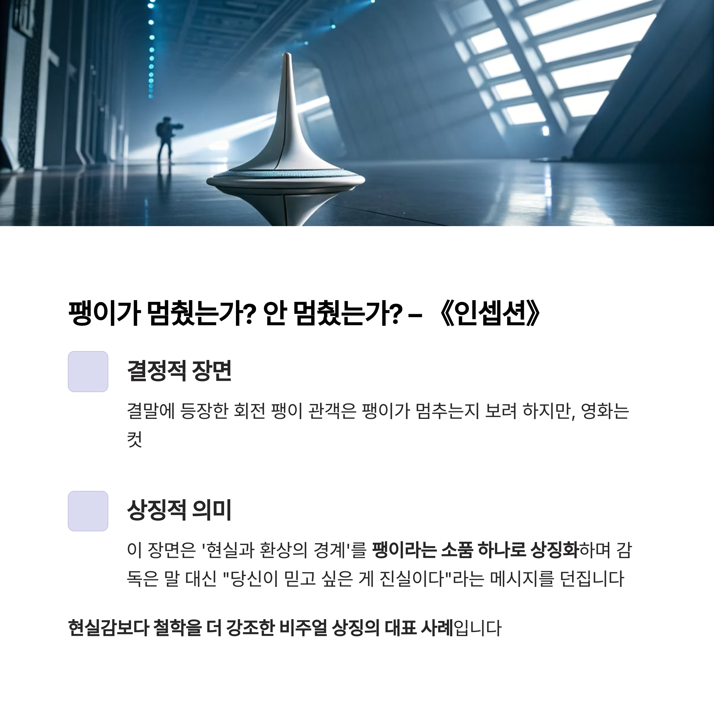 | 회전하는 팽이 | 현실과 환상의 경계, 신념의 모호함 | 인셉션 |