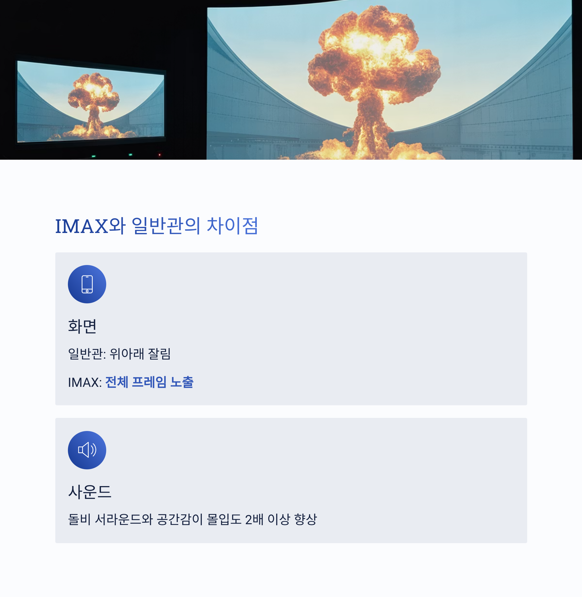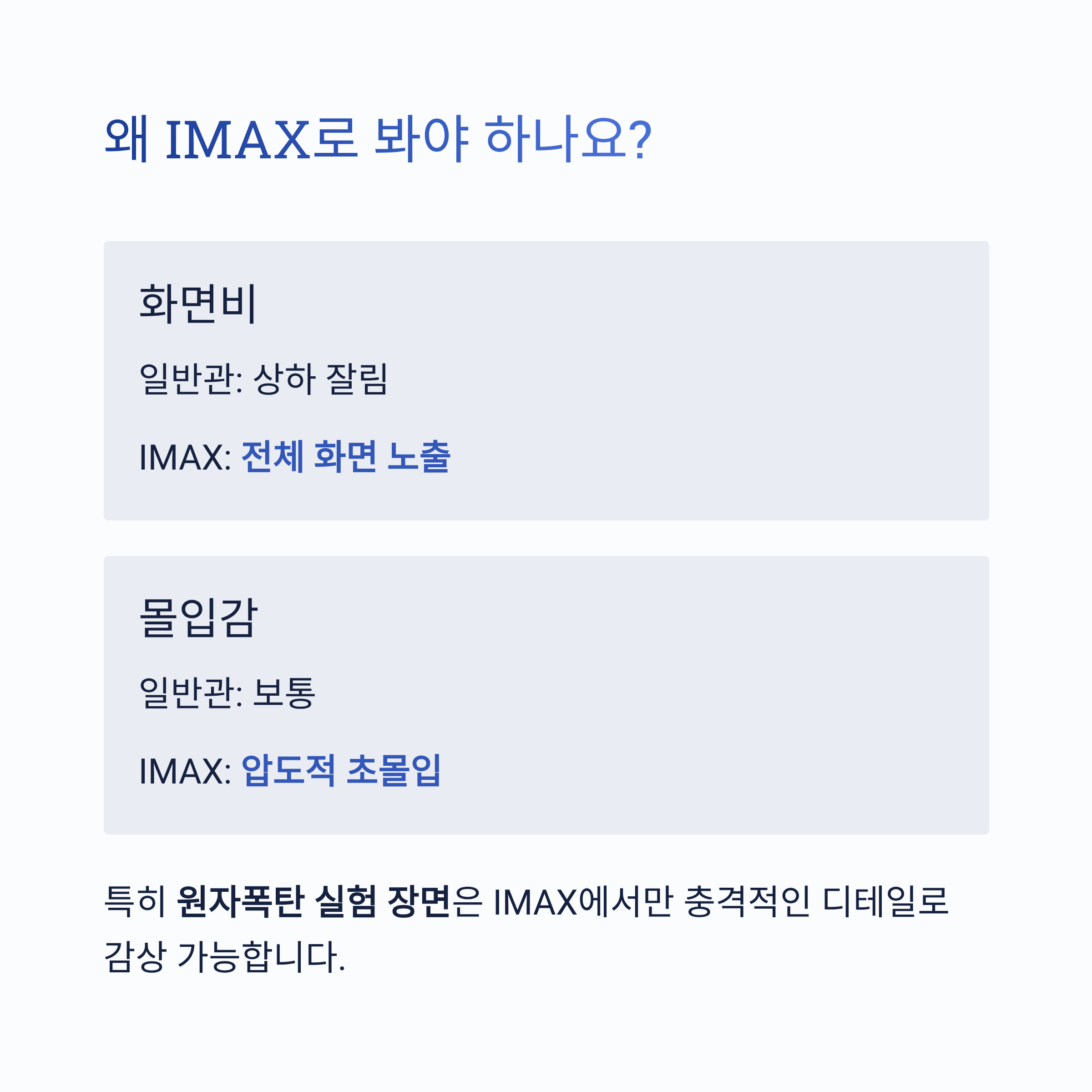 - IMAX: 전체 프레임 노출, 핵실험 장면의 임팩트가 다릅니다