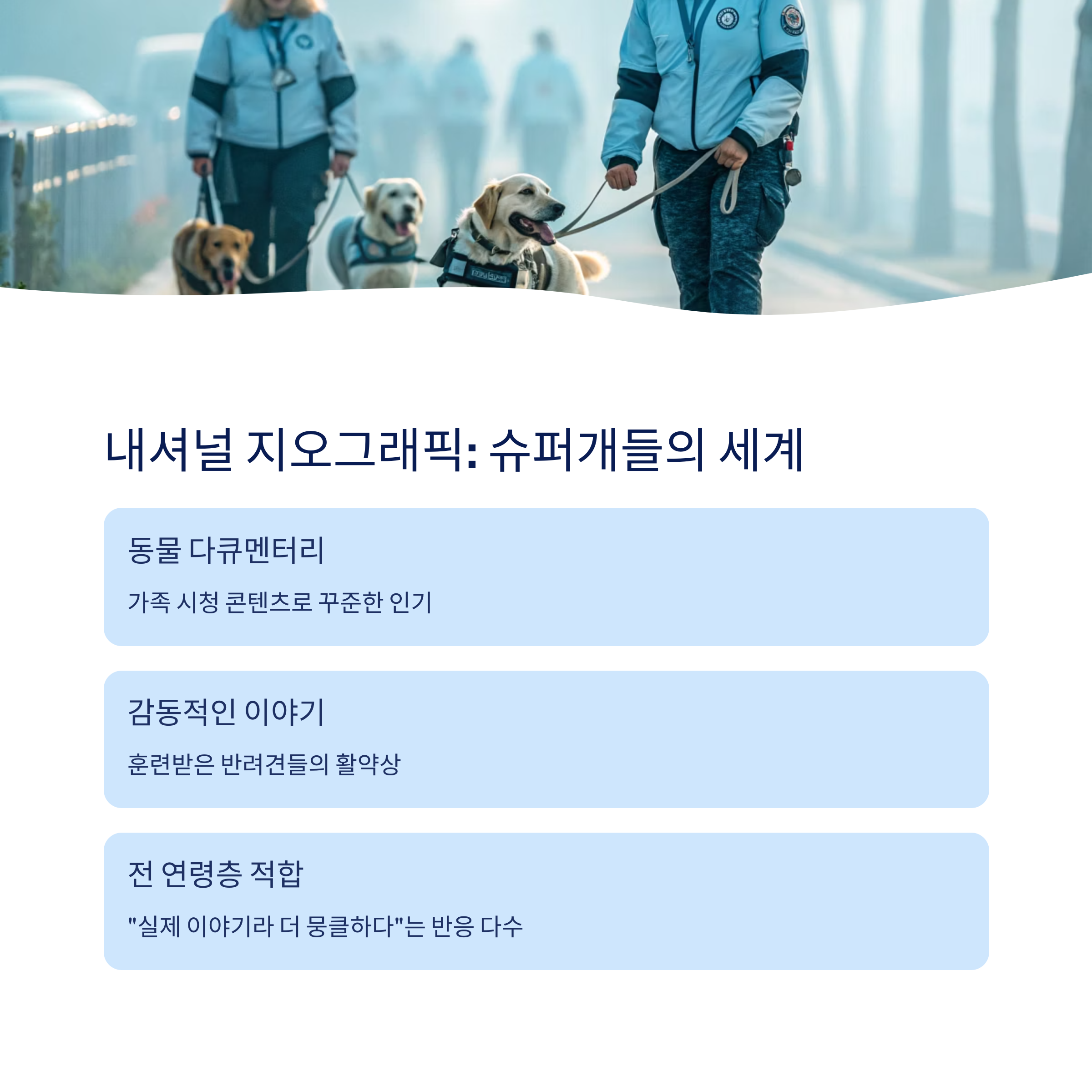‘슈퍼개들의 세계’는 훈련받은 반려견들의 활약과 감동적인 이야기를 담은 다큐 시리즈로,