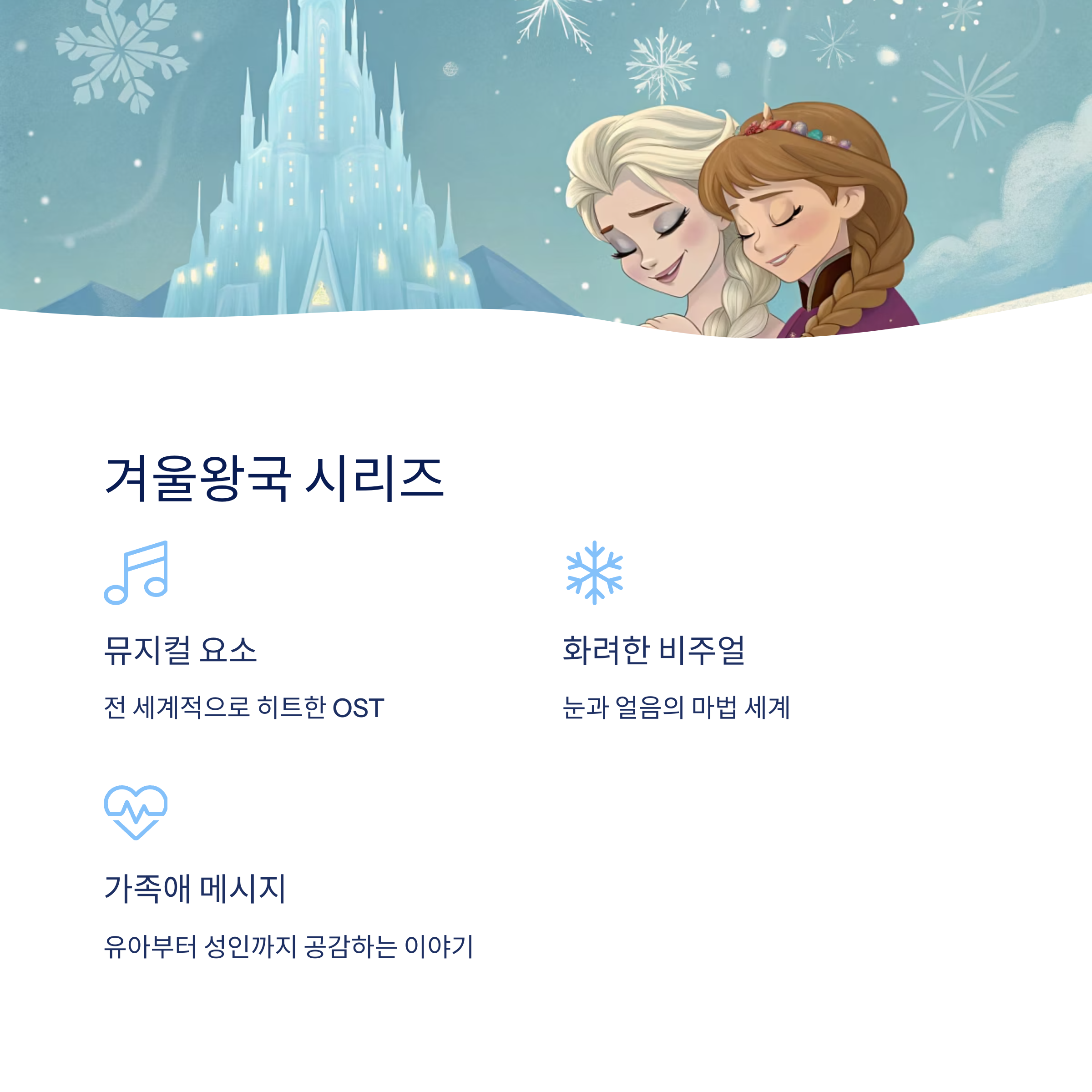 | 겨울왕국 시리즈 | 애니/뮤지컬 | 유아~성인 | 뮤지컬 + 가족 관계 |