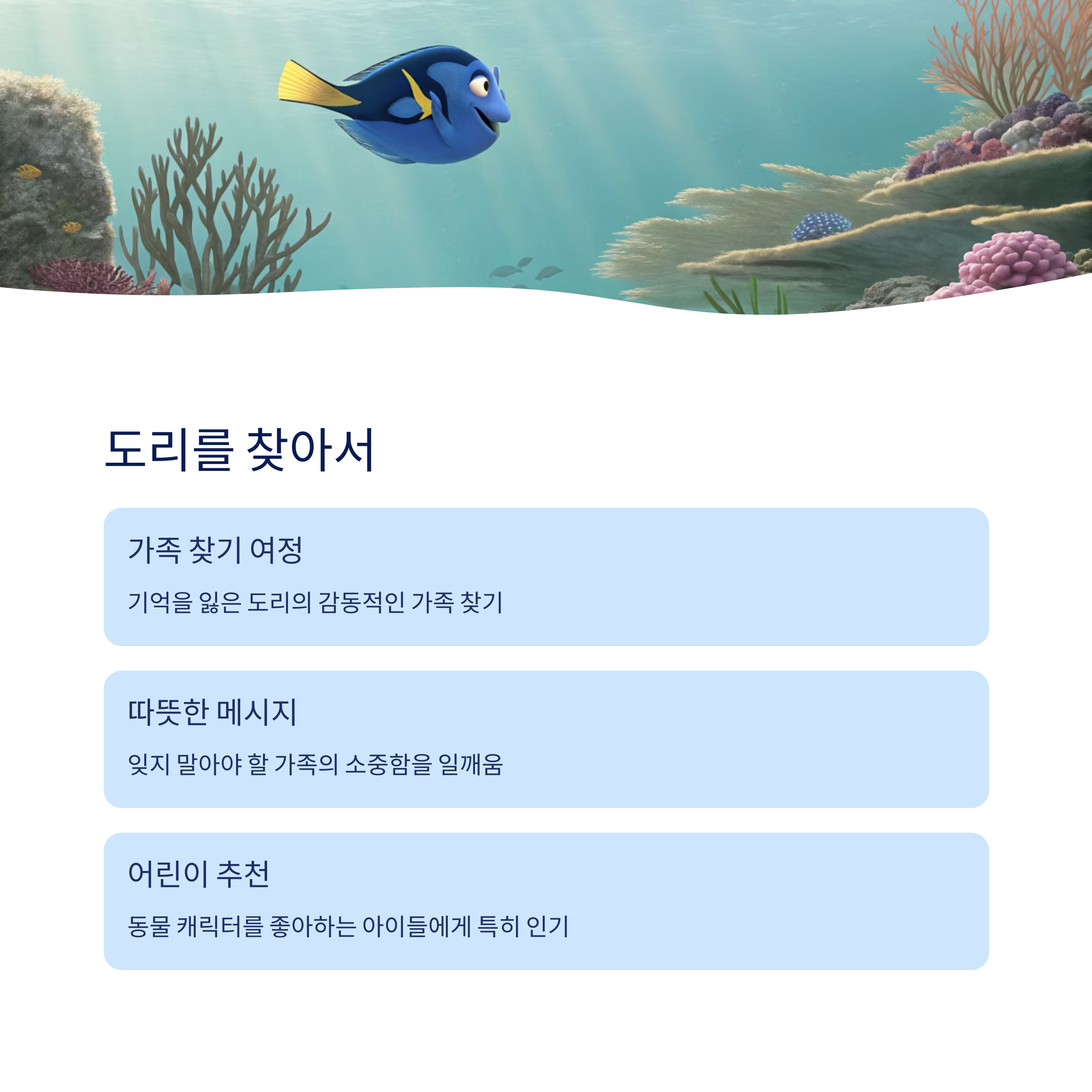 기억을 잃은 도리의 가족 찾기 여정을 그린 따뜻한 이야기입니다.