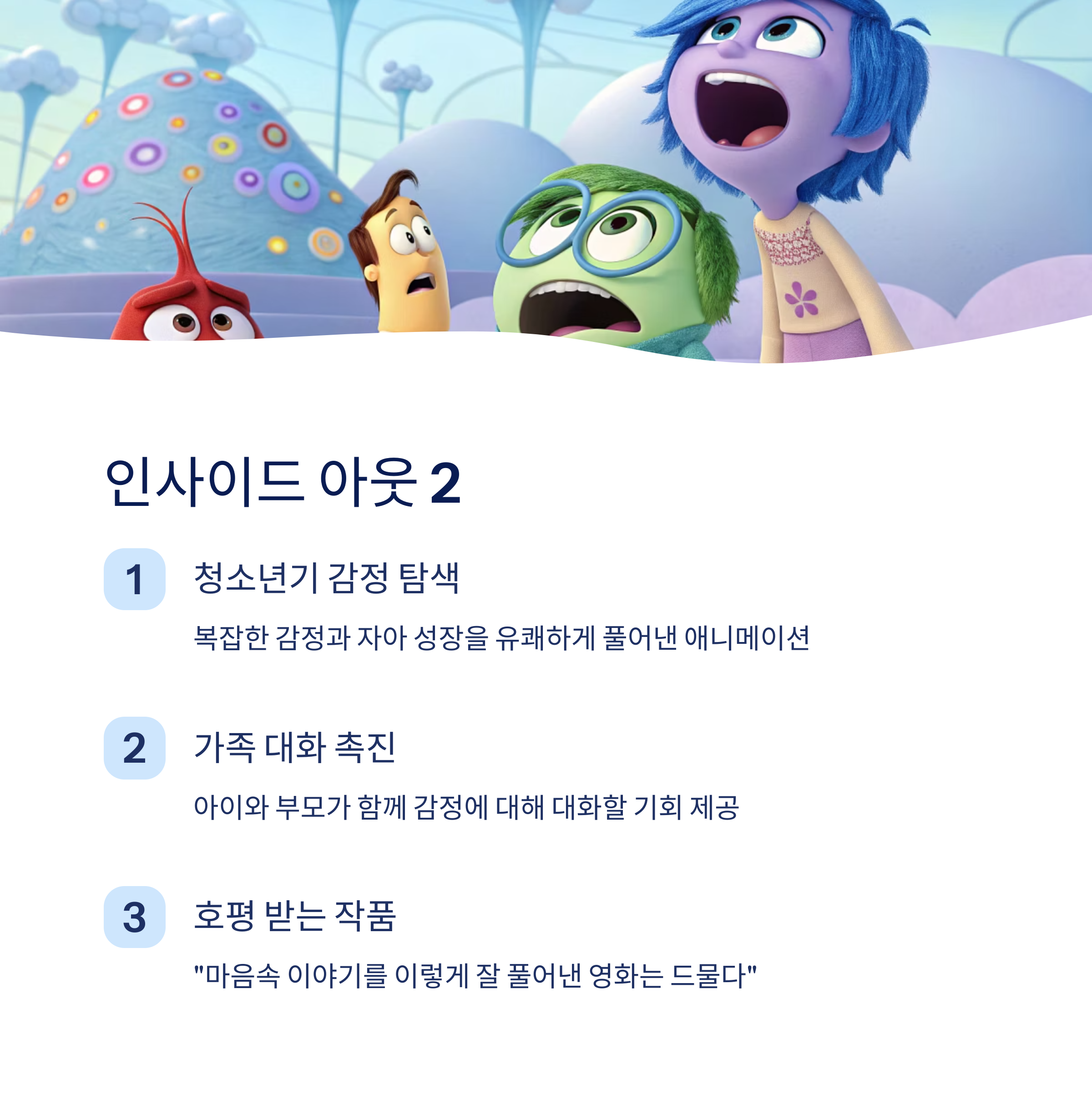 | 인사이드 아웃 2 | 애니메이션 | 초등~성인 | 감정 교육 + 성장 |