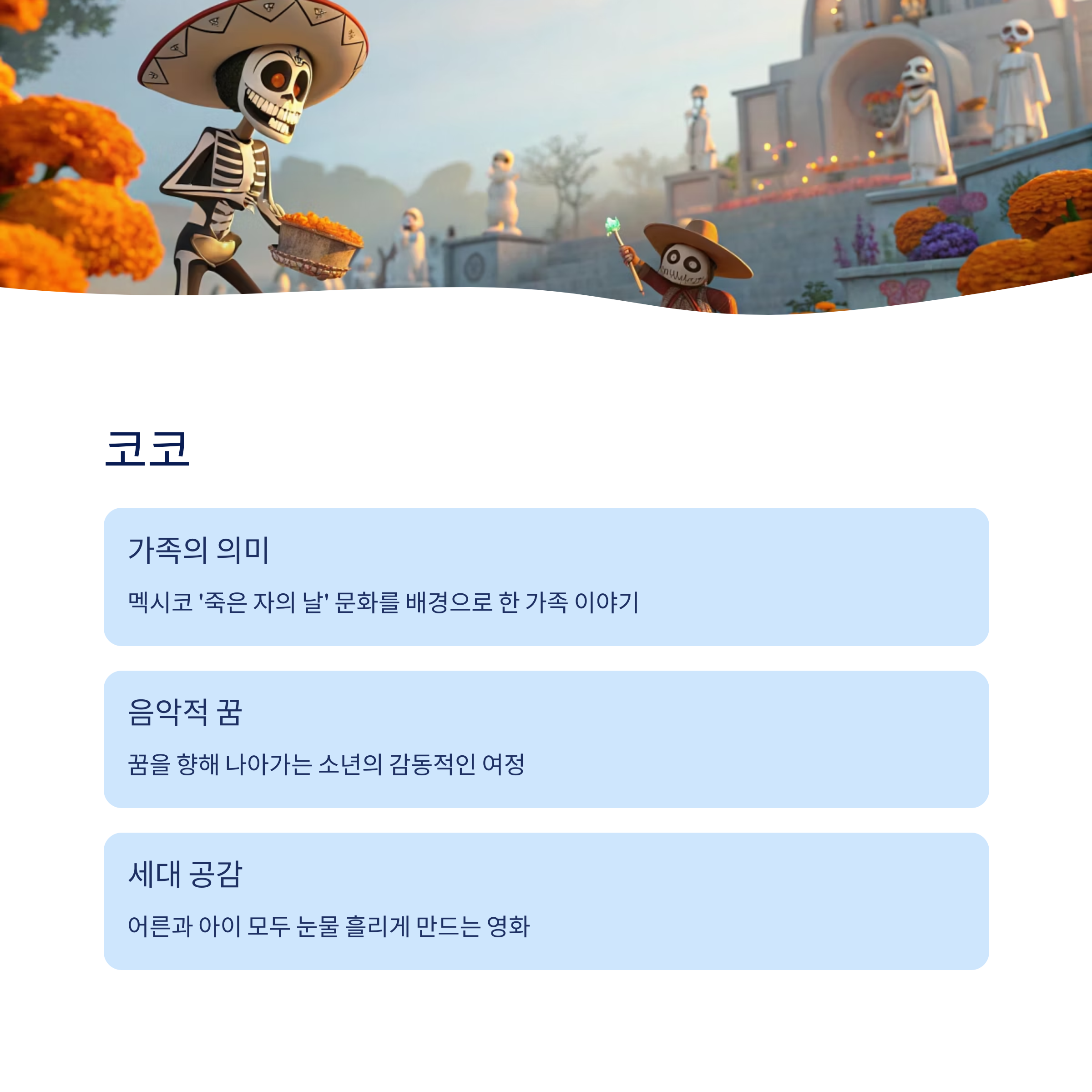 | 코코 | 애니메이션/음악 | 전 연령 | 가족애 + 눈물 |