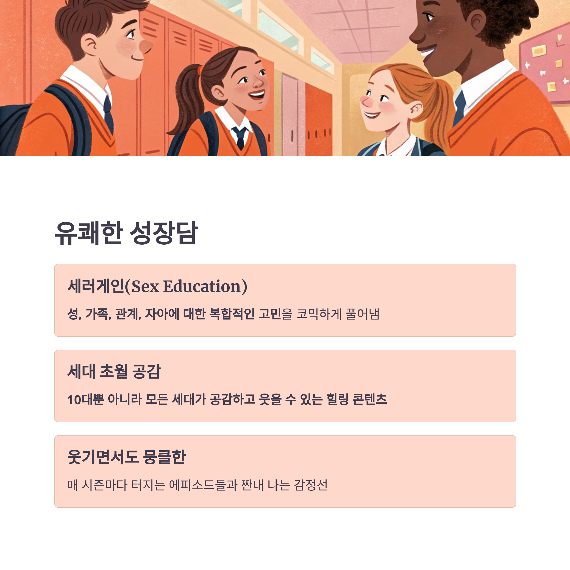 | 세러게인(Sex Education) | 성장형 드라마 코미디 | 십대+성장+사회 공감 웃음 |