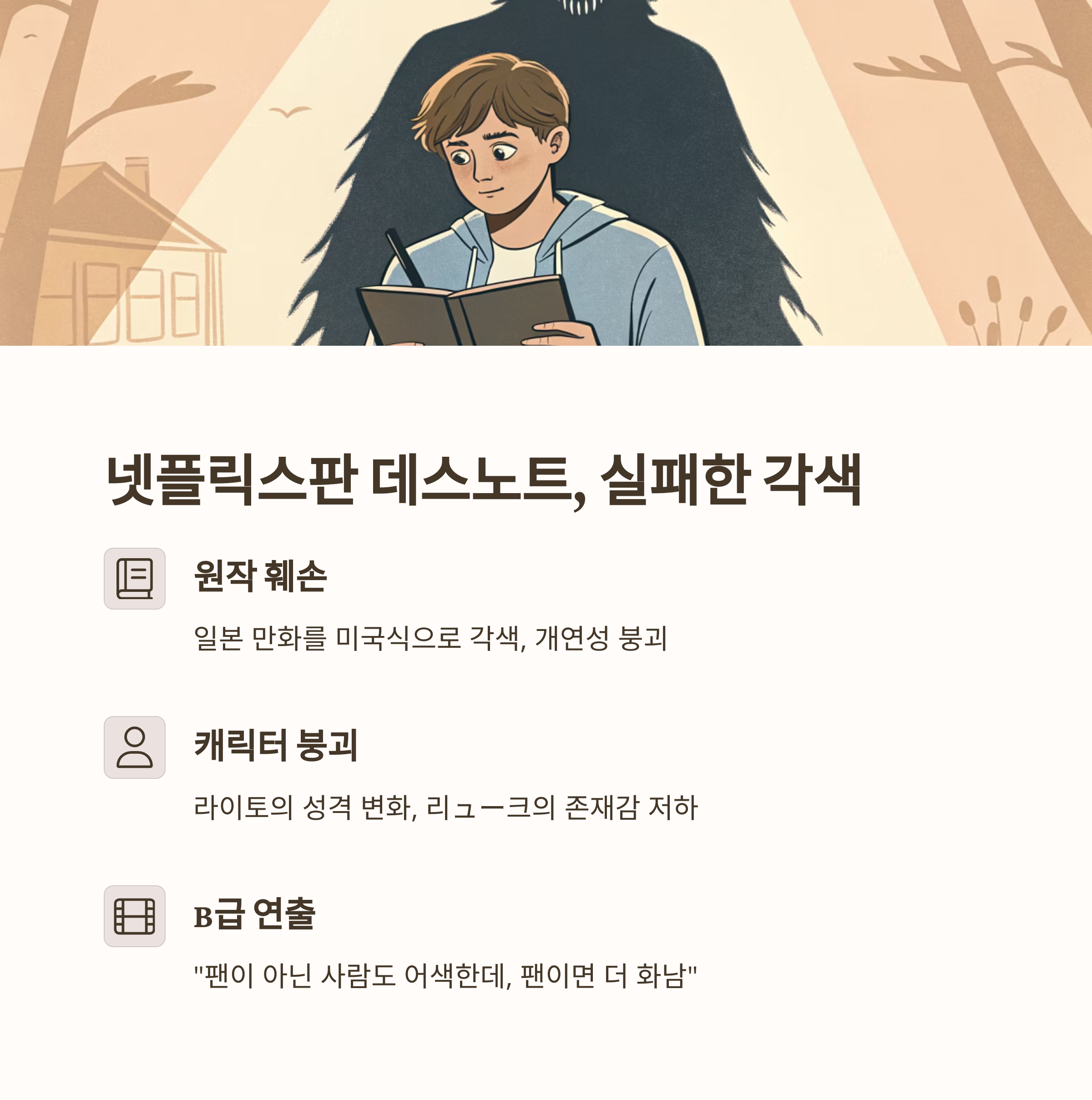 - 문제점: 라이토의 캐릭터 붕괴, 리ュー크의 존재감 저하