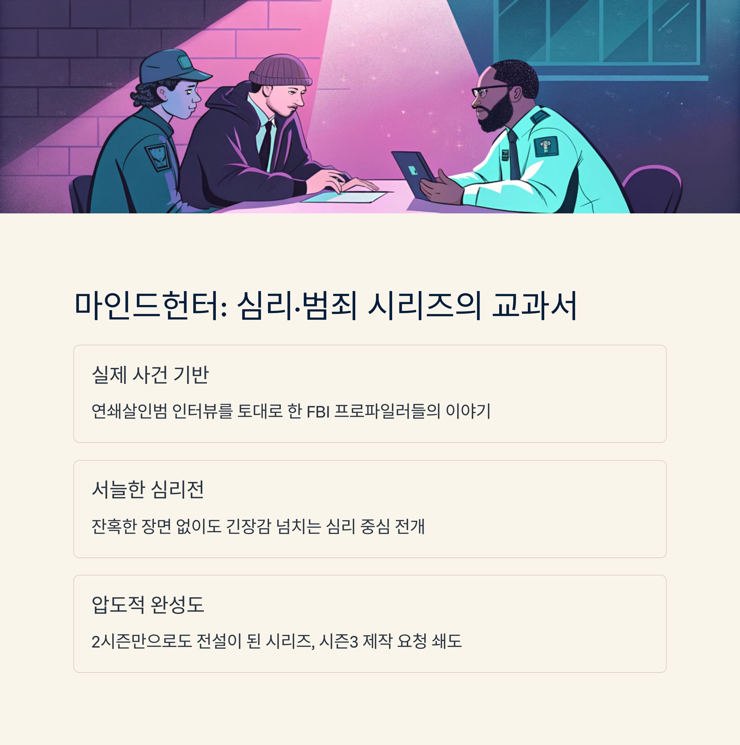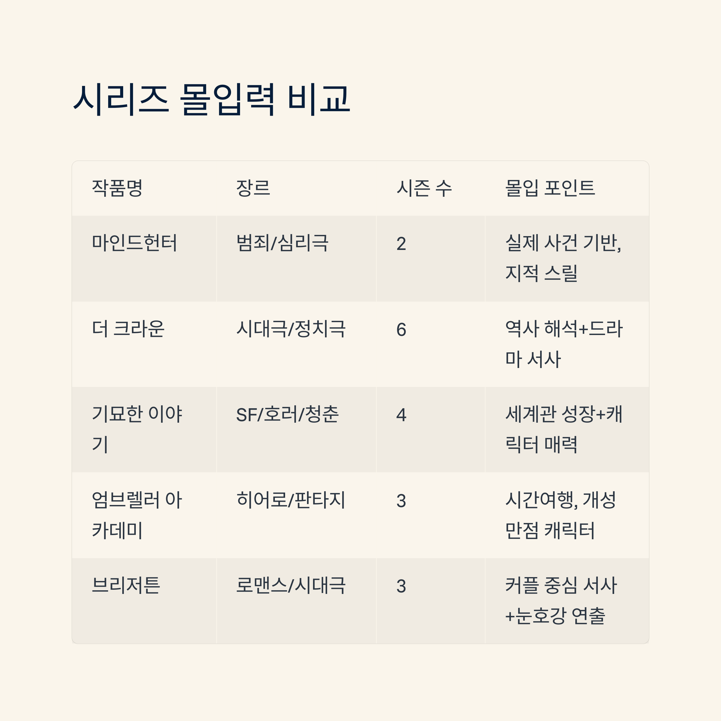| 마인드헌터 | 범죄/심리극 | 2 | 실제 사건 기반, 지적 스릴 |