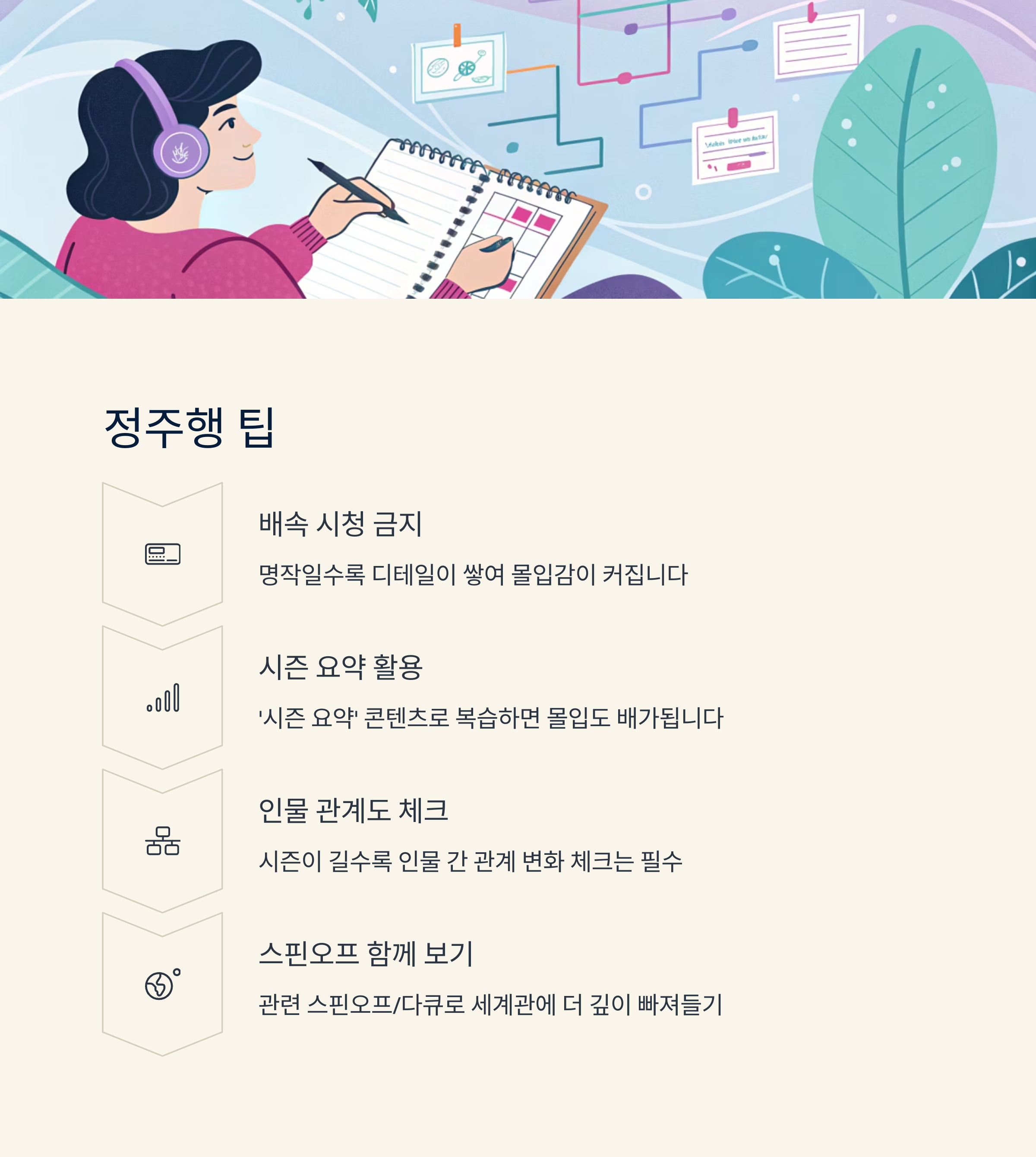 - 시즌 간 줄거리 복습 활용: ‘시즌 요약’ 콘텐츠를 먼저 보면 몰입도 배가