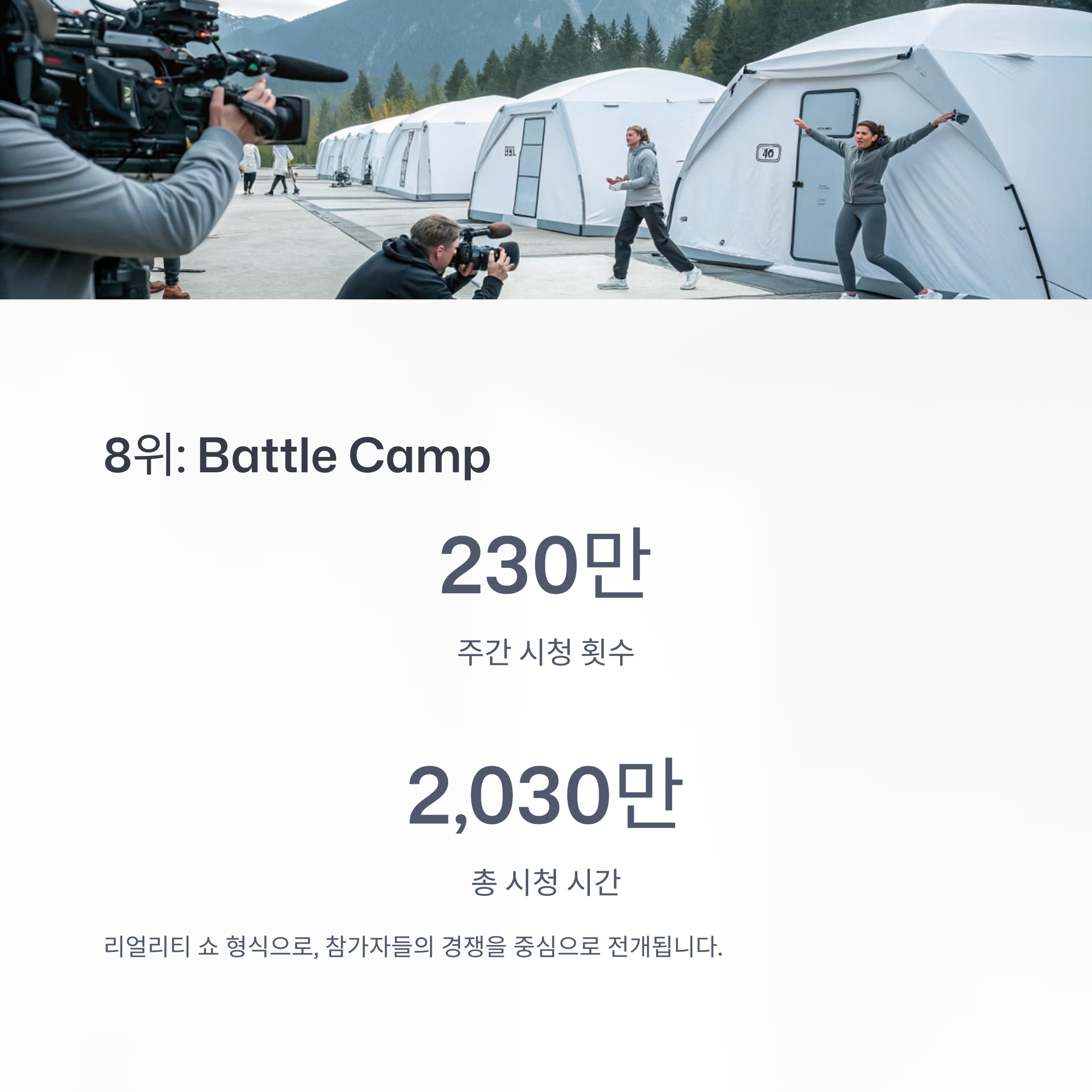특징: 리얼리티 쇼 형식으로, 참가자들의 경쟁을 중심으로 전개됩니다.
