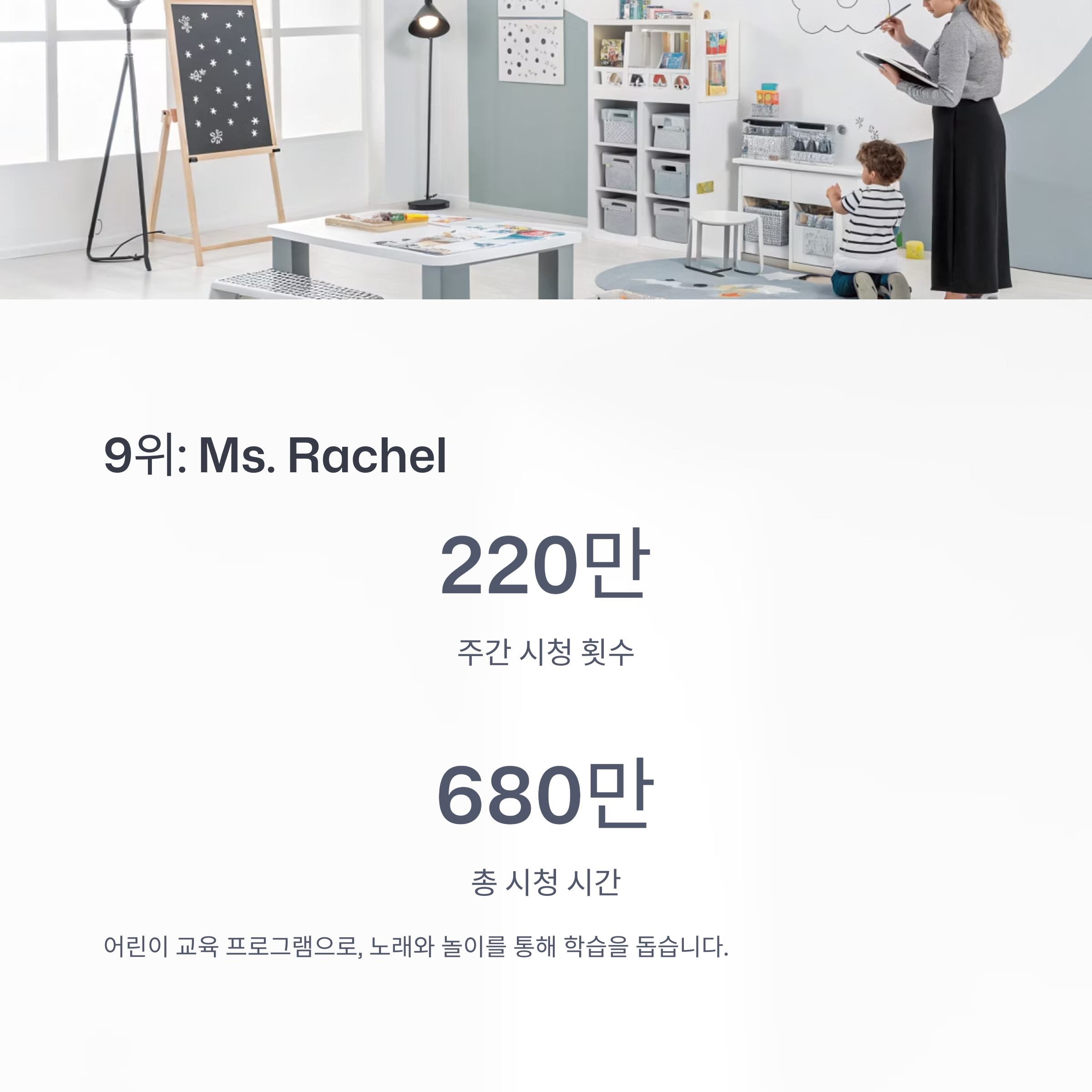 특징: 어린이 교육 프로그램으로, 노래와 놀이를 통해 학습을 돕습니다.