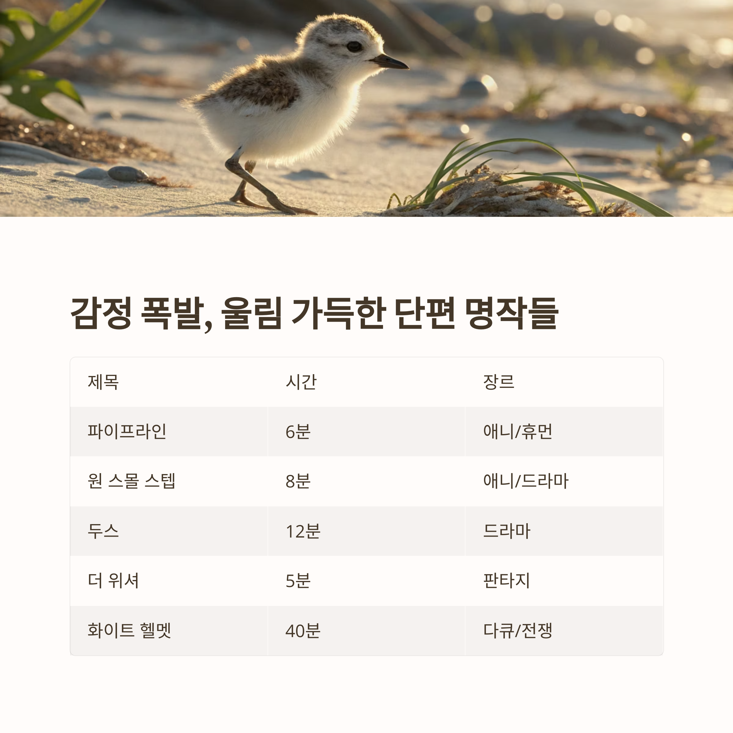 | 파이프라인 (Piper) | 6분 | 애니/휴먼 | 디즈니 감성, 성장과 도전 이야기 |