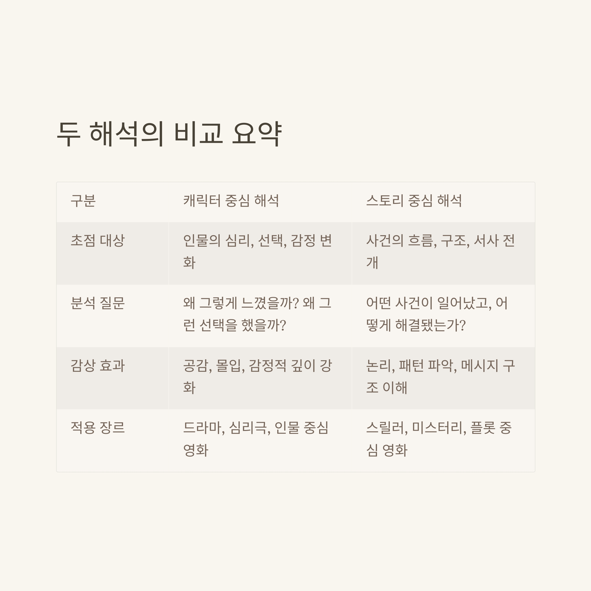 | 초점 대상 | 인물의 심리, 선택, 감정 변화 | 사건의 흐름, 구조, 서사 전개 |
