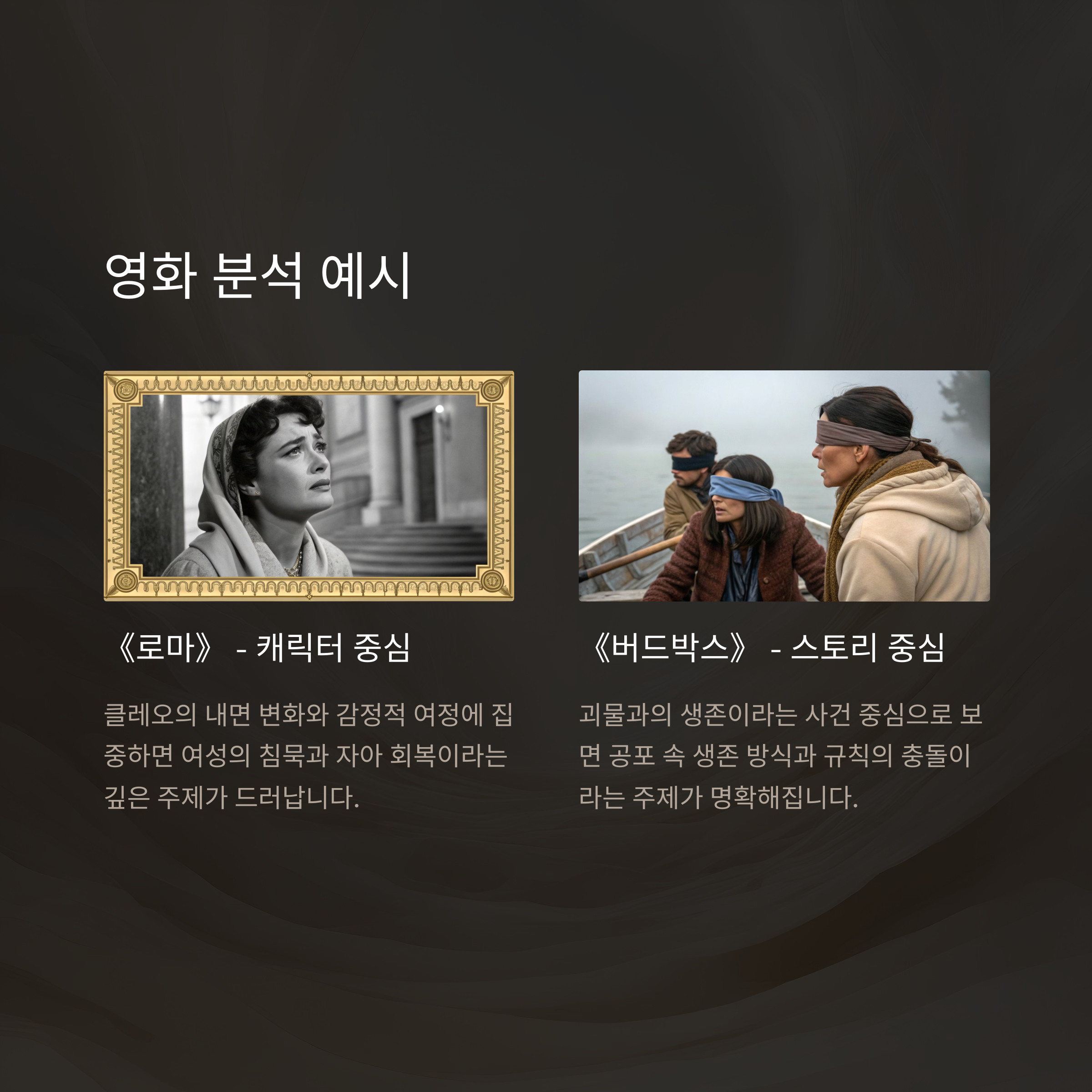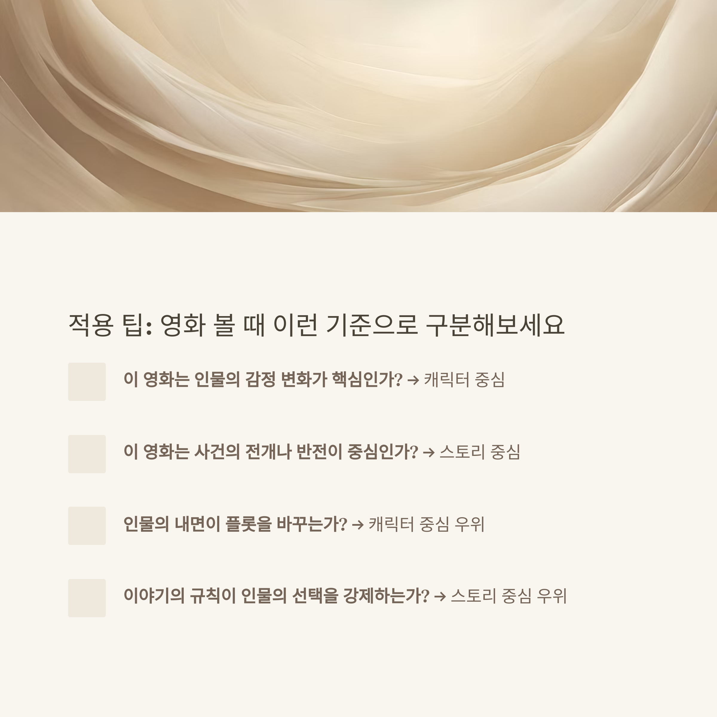 - 이 영화는 인물의 감정 변화가 핵심인가? → 캐릭터 중심