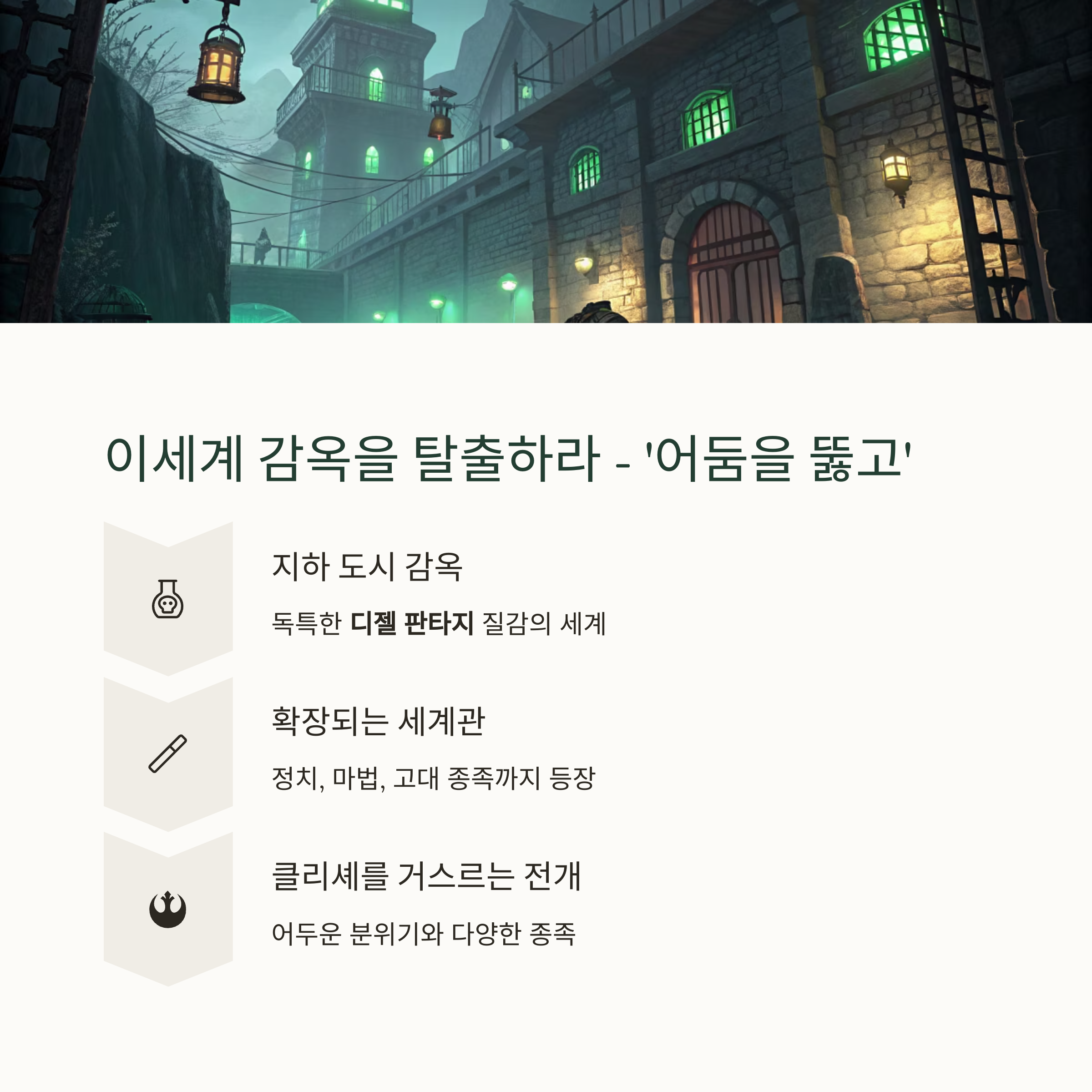 | 디스토피아 | 어둠을 뚫고, 아케인 | 어두운 세계관 + 시각 예술 |