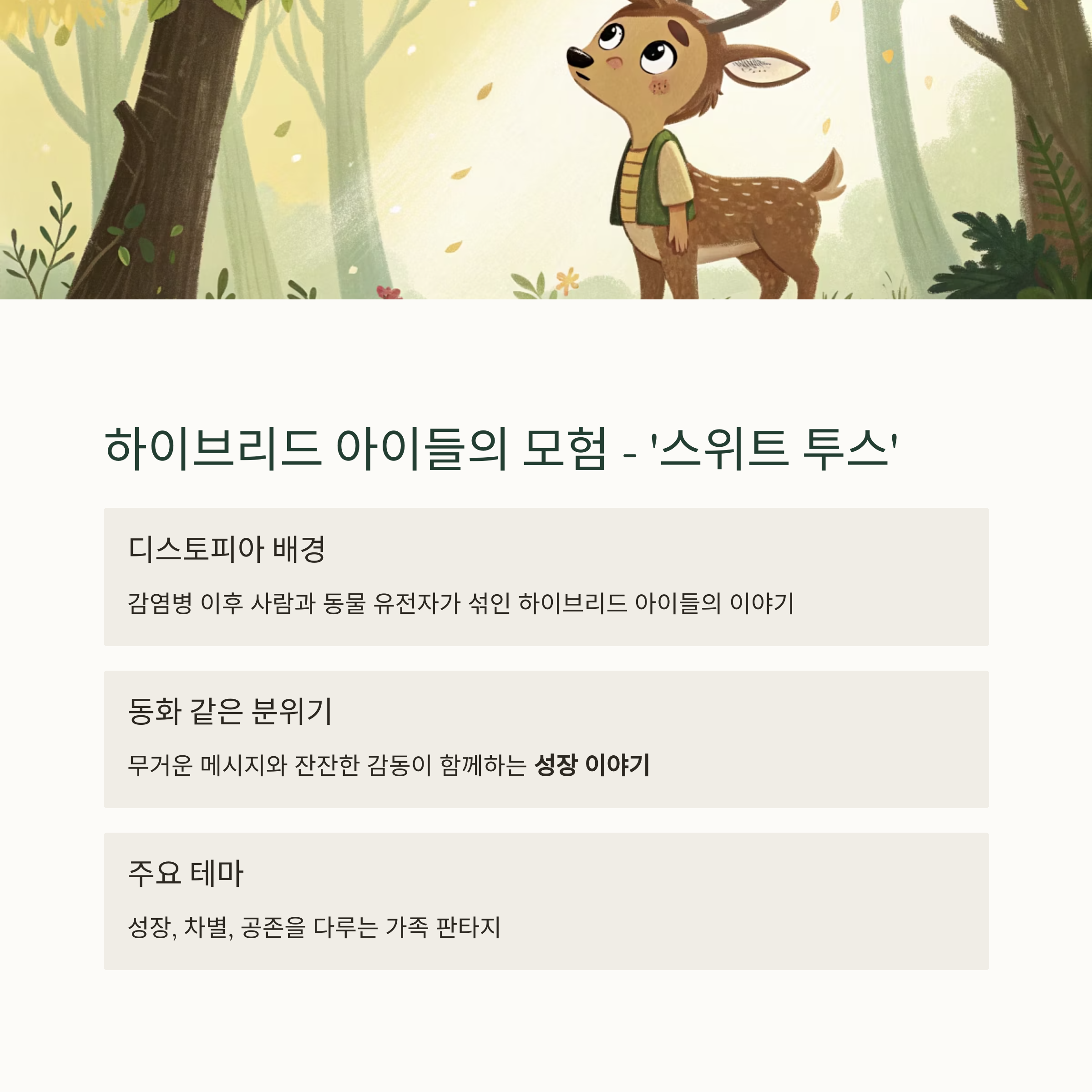 | 감성 성장 | 스위트 투스 | 동화적 설정, 진정성 |