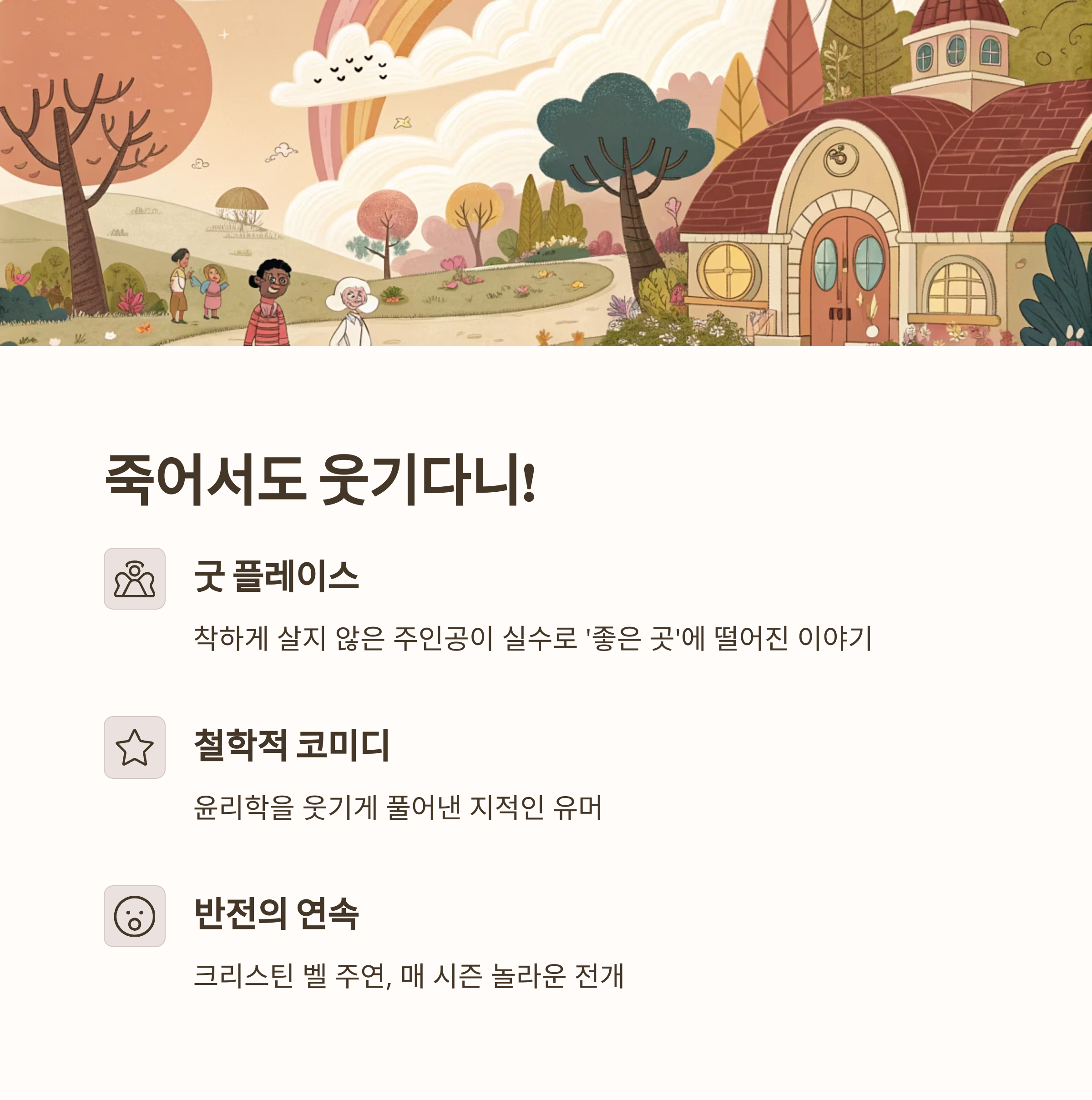 | 독특한 세계관 | 굿 플레이스, 디스인챈트 | 철학, 판타지 배경 |
