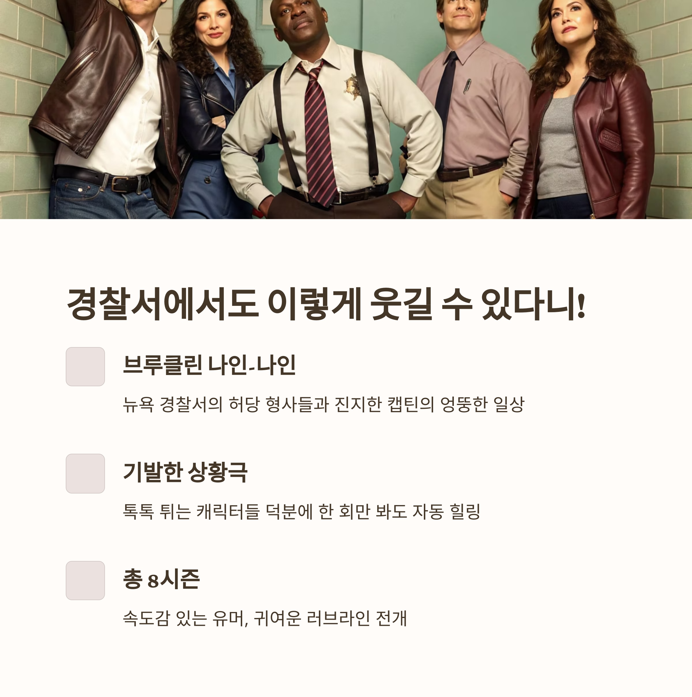 | 시트콤 | 브루클린 나인-나인 | 형사물 + 하이텐션 유머 |
