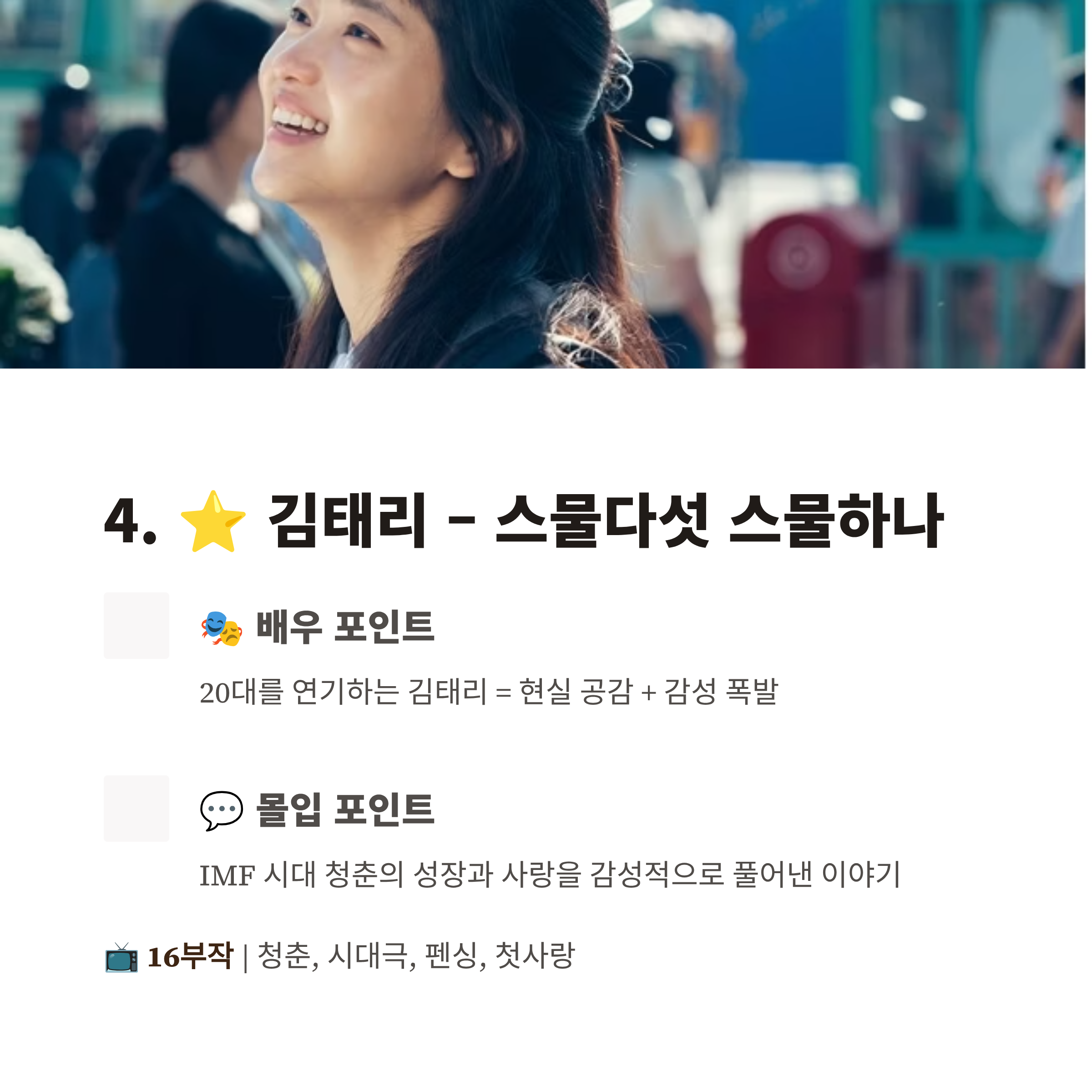 - 🎭 배우 포인트: 20대를 연기하는 김태리 = 현실 공감 + 감성 폭발