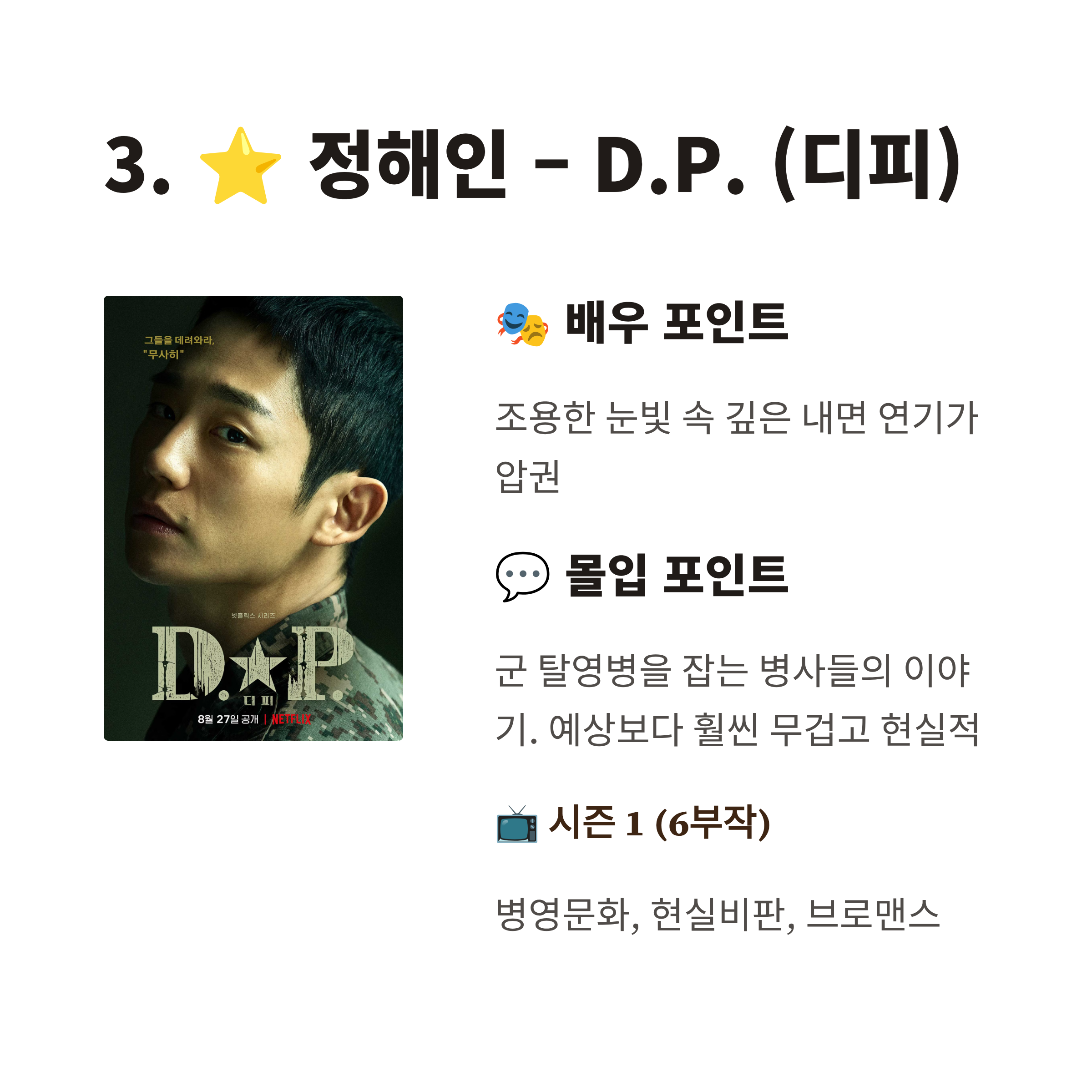 - 💬 몰입 포인트: 군 탈영병을 잡는 병사들의 이야기. 예상보다 훨씬 무겁고 현실적