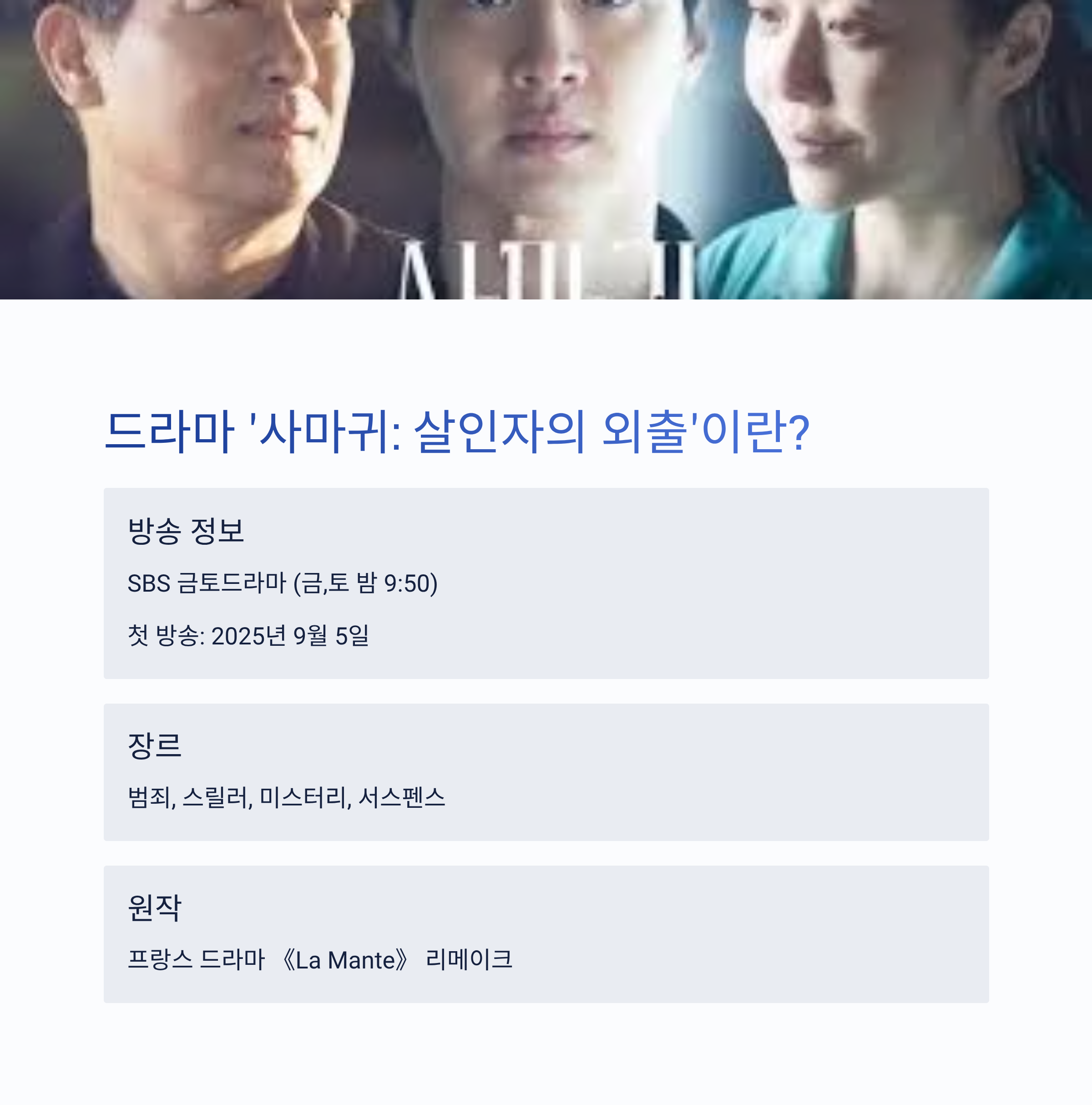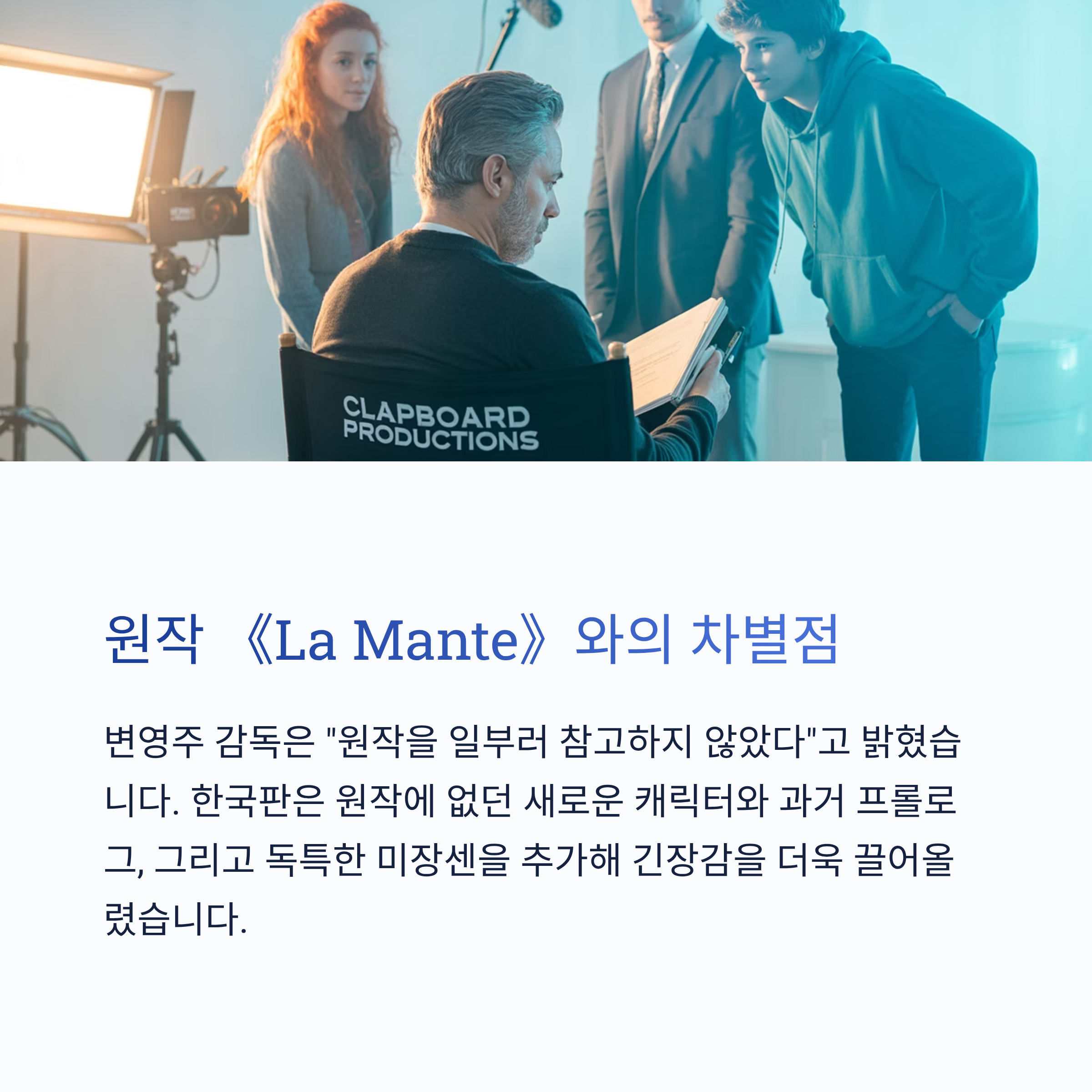 그리고 원작 프랑스 드라마 'La Mante'의 특징과 리메이크 포인트까지 꼼꼼하게 정리해드립니다.
