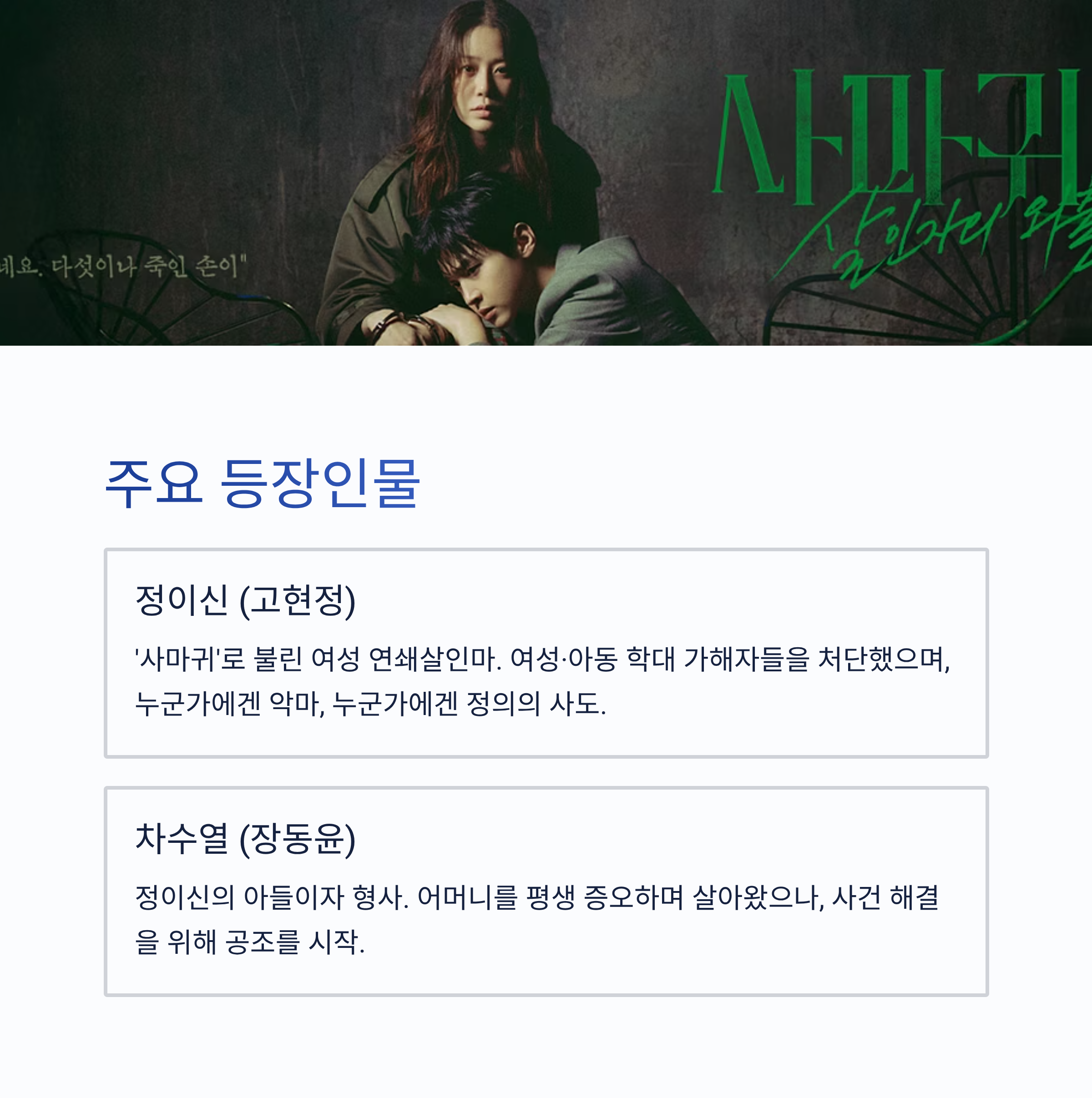 | 정이신 | 고현정 | '사마귀'로 불린 여성 연쇄살인마. 피해자들은 모두 여성·아동 학대 가해자였으며, 누군가에겐 악마, 누군가에겐 정의로운 존재로 여겨짐. |