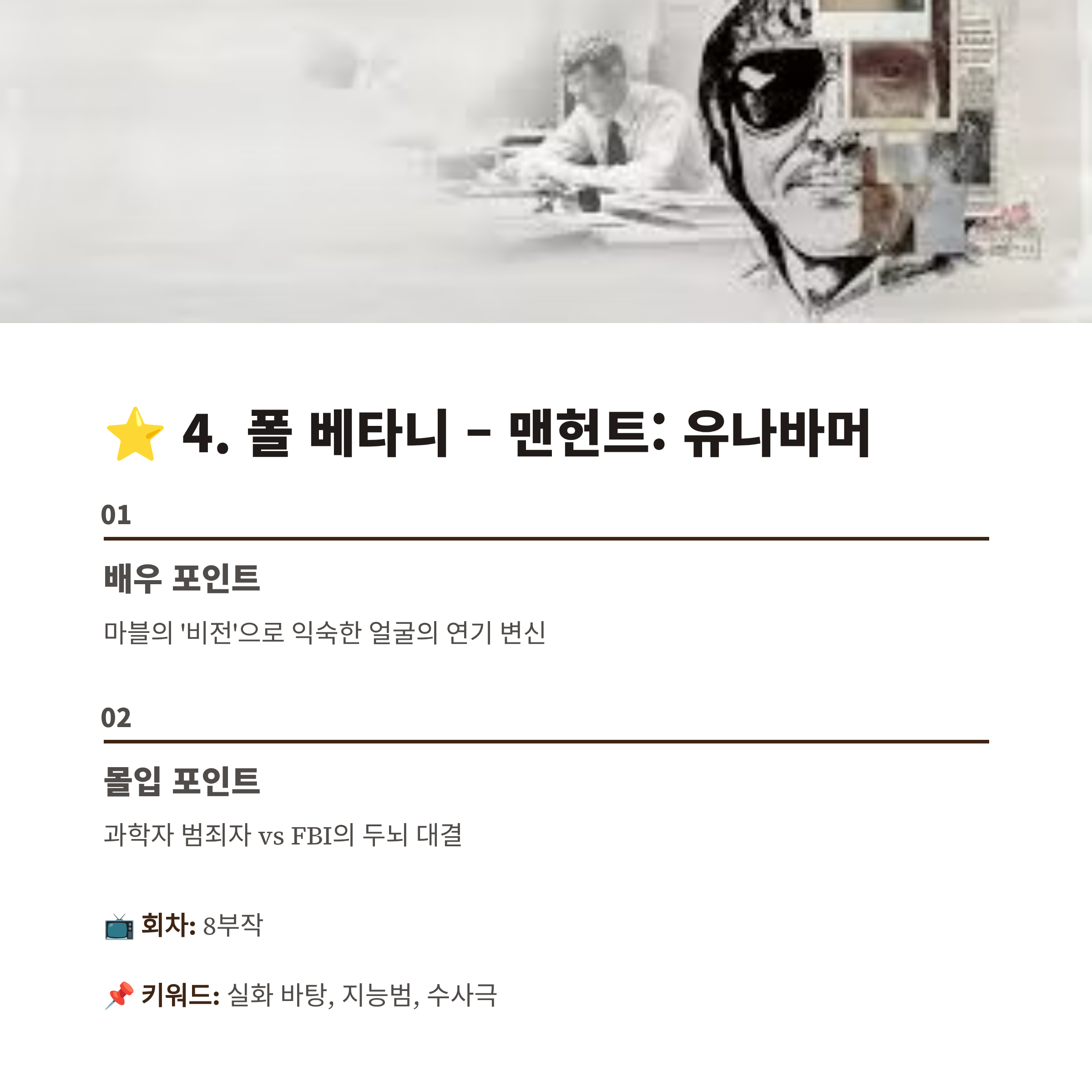 - 🎯 몰입 포인트: 과학자 범죄자 vs FBI의 두뇌 대결
