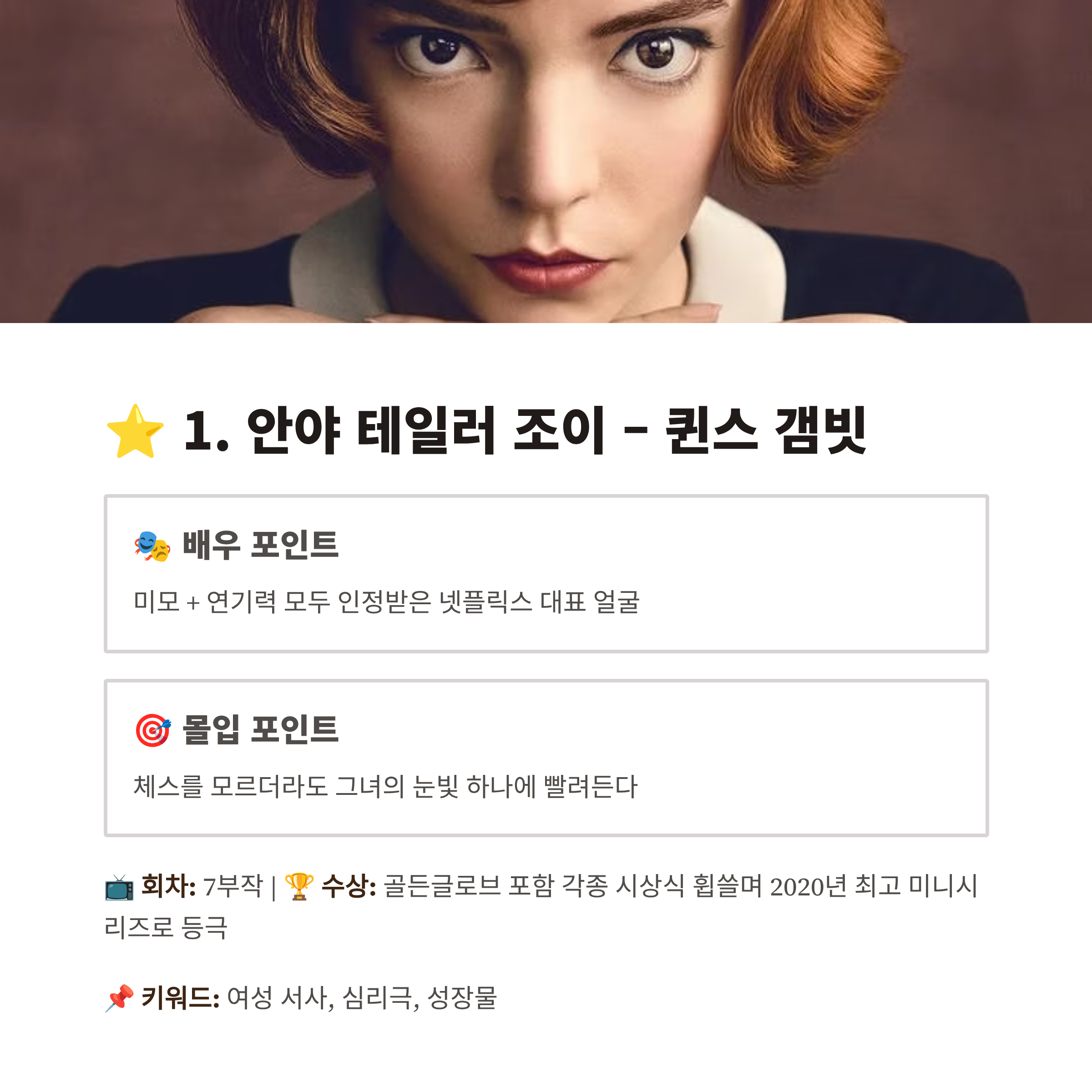 - 🎯 몰입 포인트: 체스를 모르더라도 그녀의 눈빛 하나에 빨려든다
