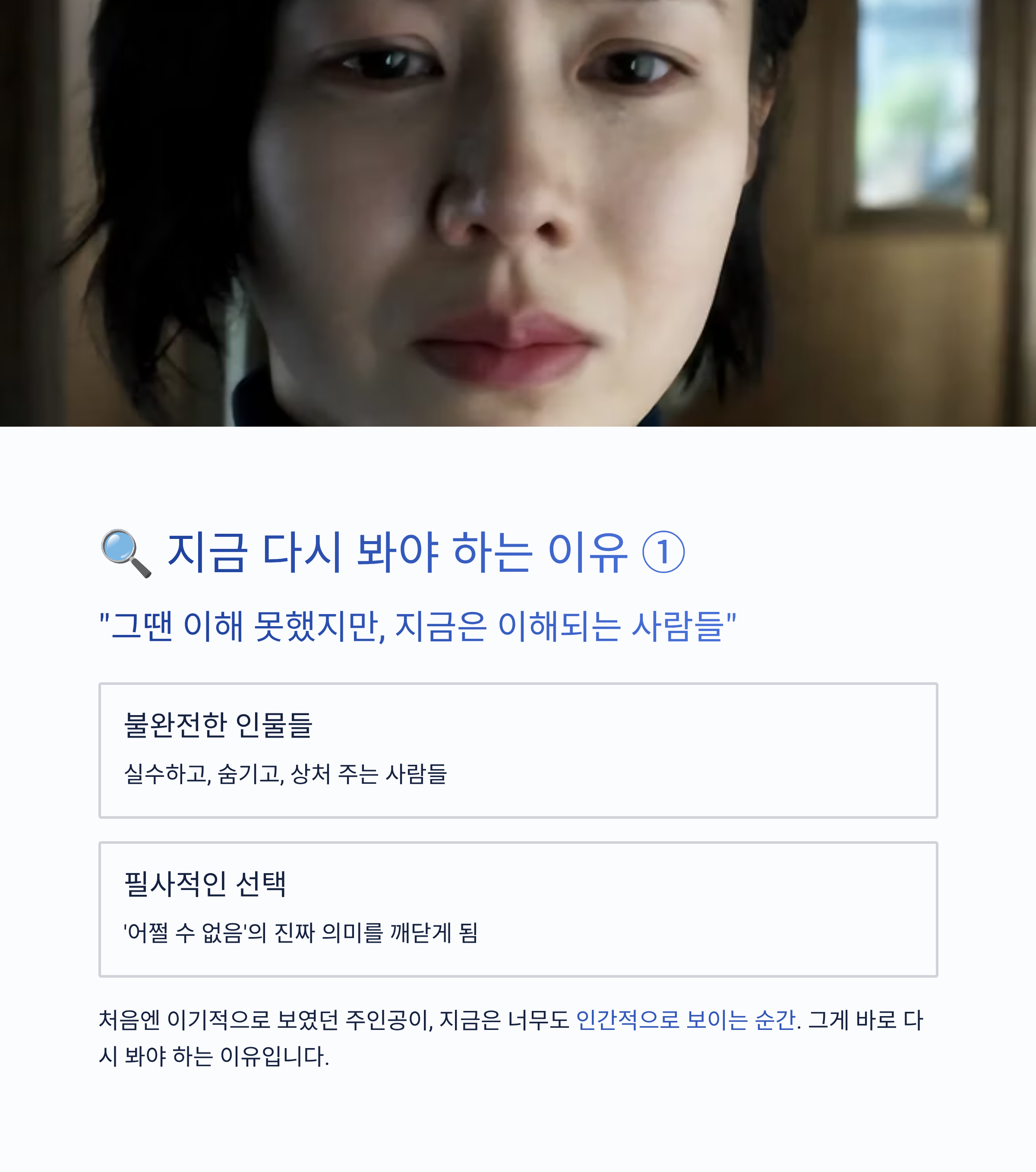 처음 볼 땐 대사나 전개에 집중하느라 놓쳤던 미세한 표정, 카메라 워킹, 침묵의 순간들.