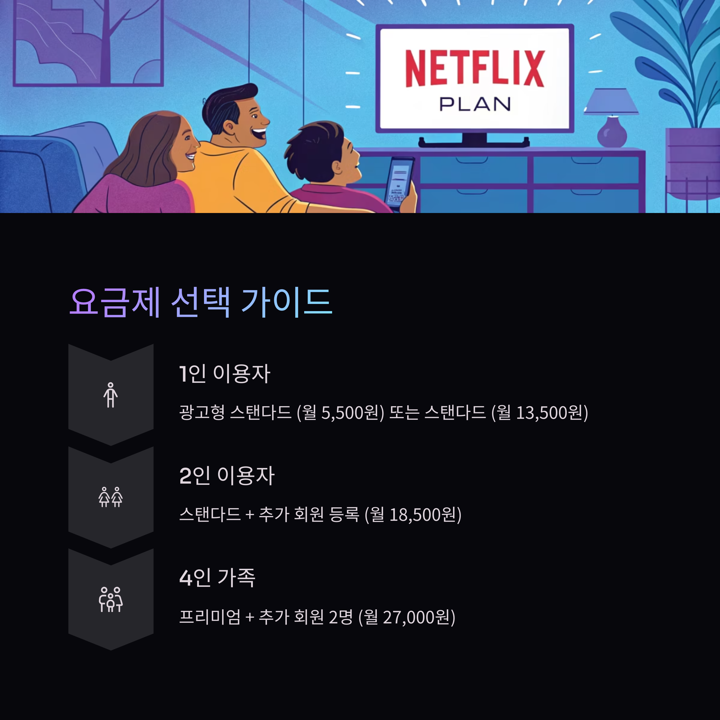 광고형 스탠다드는 월 5,500원으로 저렴하지만, 광고가 포함되어 있어 몰입감이 떨어질 수 있습니다. 반면, 스탠다드는 광고 없이 Full HD 화질을 제공하며, 추가 요금으로 1명을 더 등록할 수 있어 2인이 이용하기에 적합합니다. 프리미엄은 4K UHD 화질과 최대 4명까지 동시 시청이 가능하여 가족 단위 이용자에게 추천됩니다.
