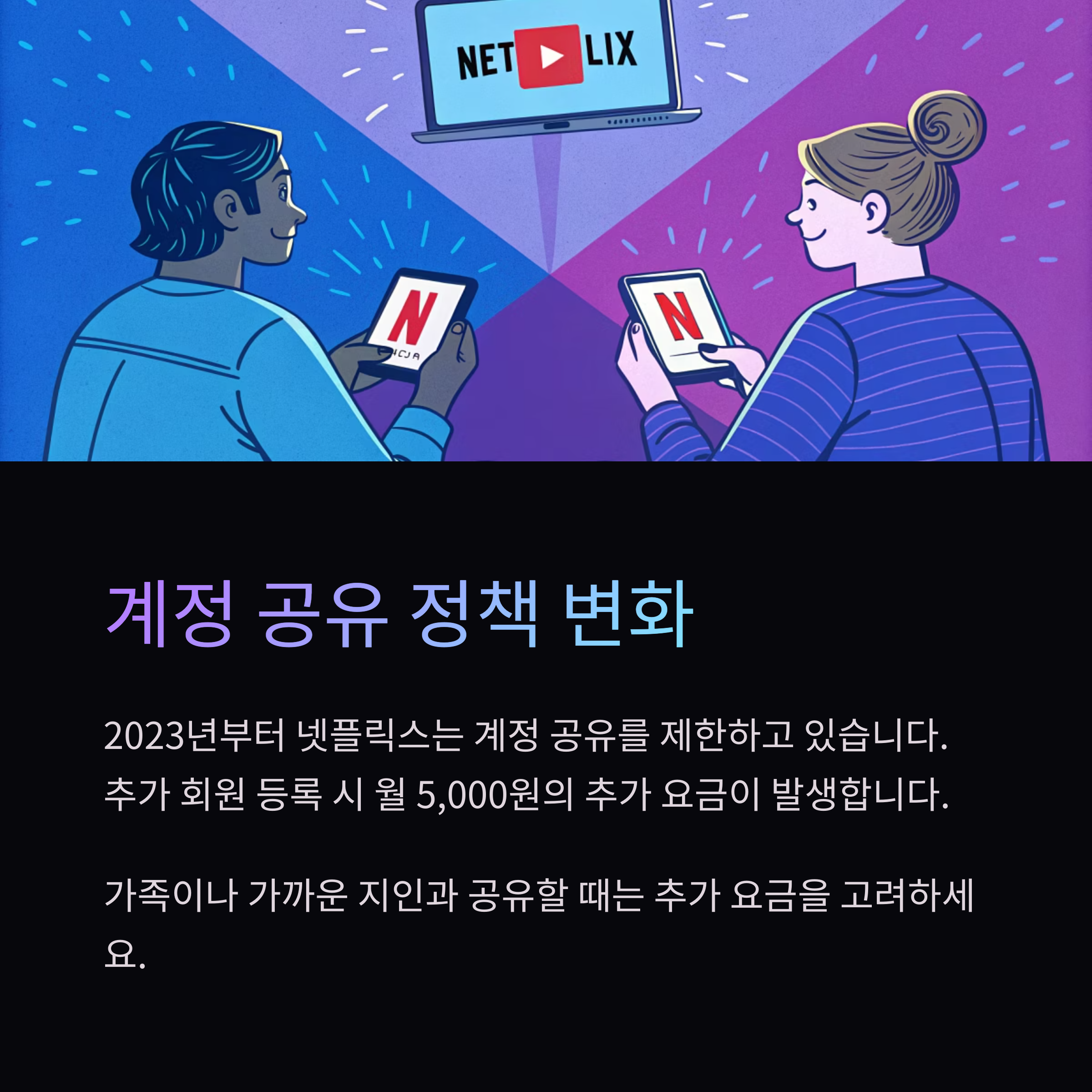 2023년부터 넷플릭스는 계정 공유를 제한하고 있으며, 추가 회원 등록 시 월 5,000원의 추가 요금이 발생합니다. 따라서 가족이나 가까운 지인과의 공유를 고려할 때는 이 점을 유의해야 합니다.