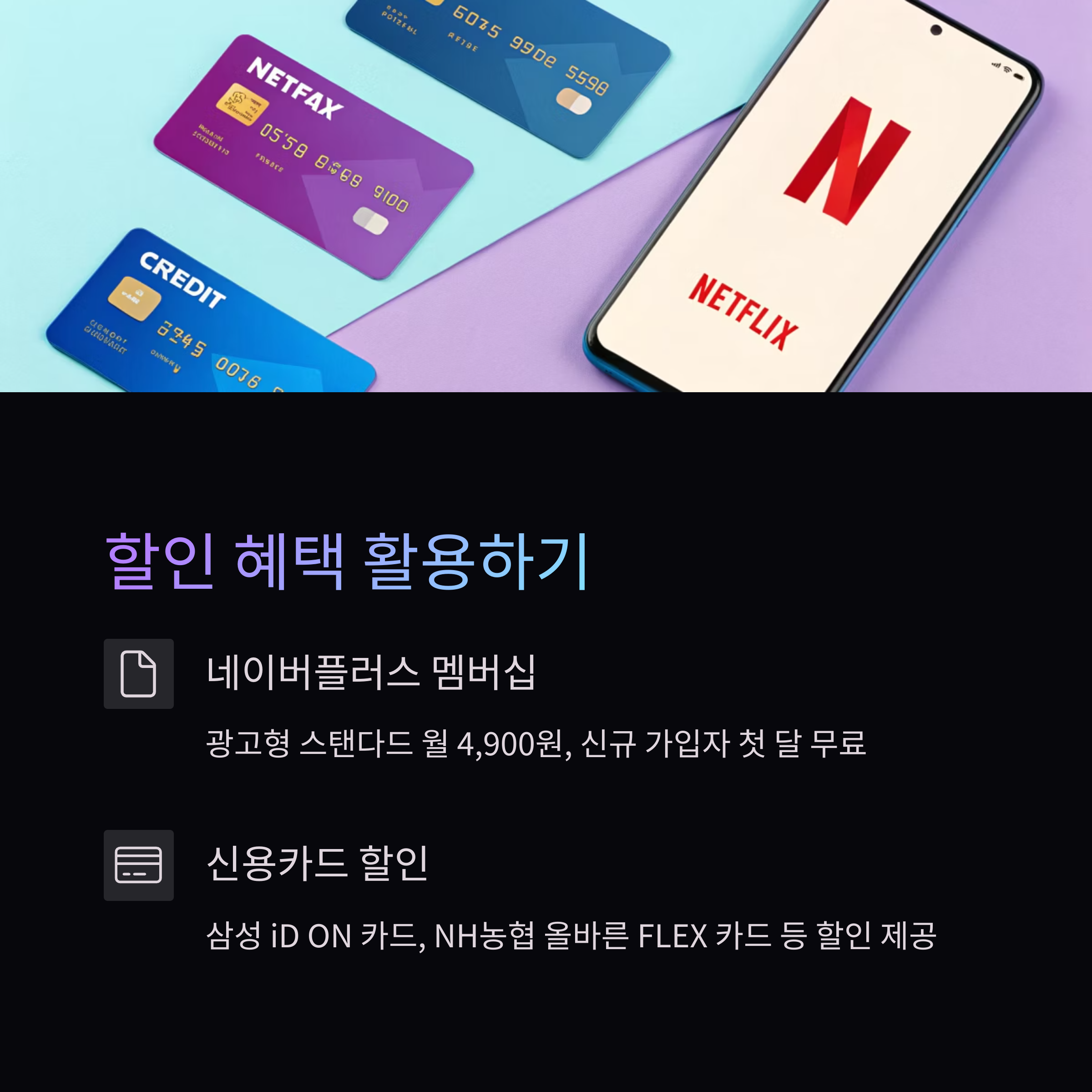 - 신용카드 할인: 삼성 iD ON 카드, NH농협 올바른 FLEX 카드 등에서 넷플릭스 구독료 할인 혜택을 제공합니다.