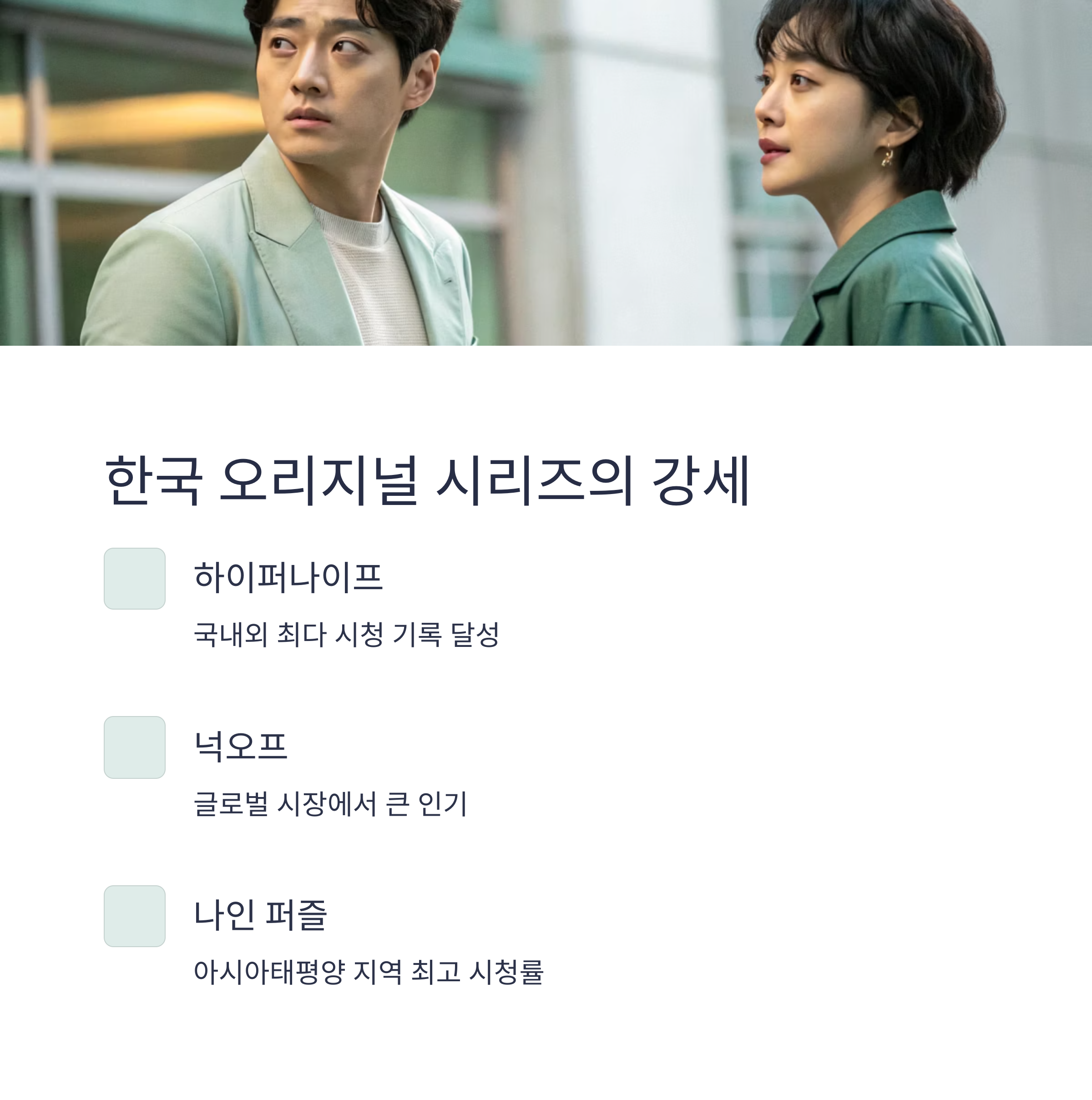 | 한국 오리지널 | 하이퍼나이프, 넉오프, 나인 퍼즐 | 스릴러, 범죄, 미스터리 |