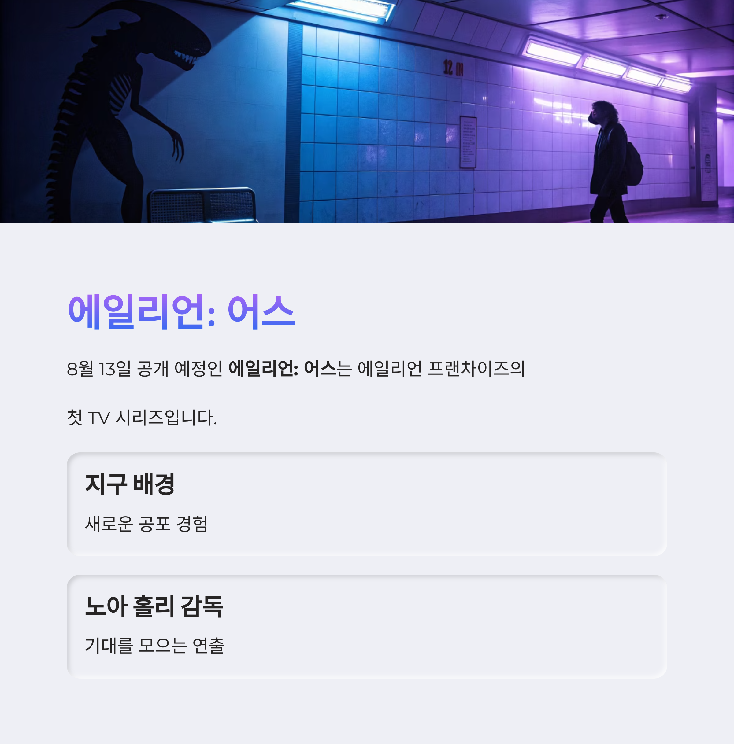 8월 13일 공개 예정인 '에일리언: 어스'는 에일리언 프랜차이즈의 첫 TV 시리즈로, 지구를 배경으로 한 새로운 공포를 선사할 예정입니다. 노아 홀리 감독이 연출을 맡아 기대를 모으고 있습니다.
