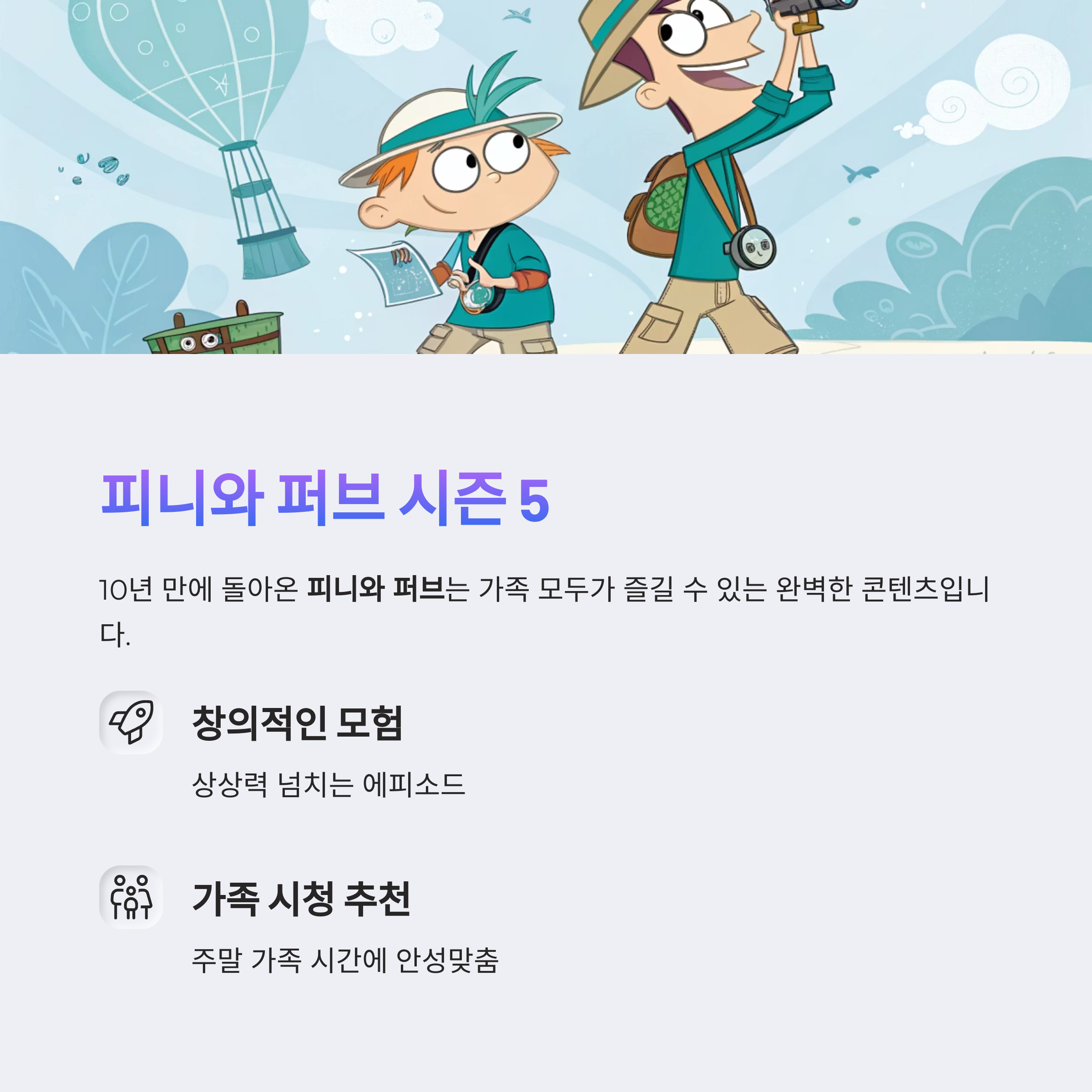 | 애니메이션 | 피니와 퍼브 시즌 5 | 가족 친화적 콘텐츠 |