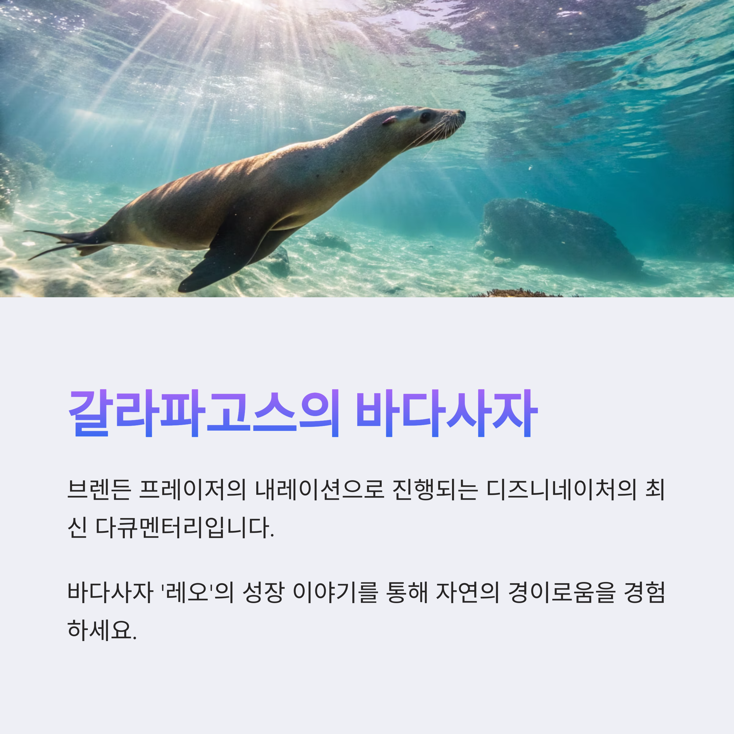 브렌든 프레이저의 내레이션으로 진행되는 '갈라파고스의 바다사자'는 디즈니네이처의 최신 다큐멘터리로, 바다사자 '레오'의 성장 이야기를 통해 자연의 경이로움을 전달합니다.