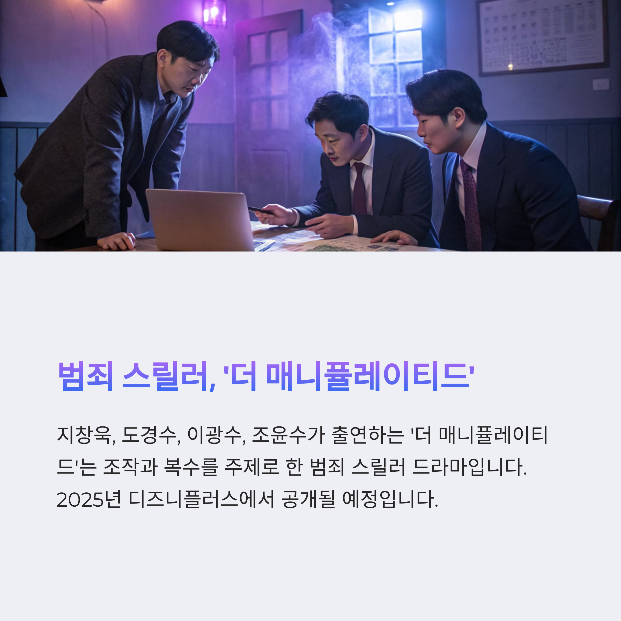 지창욱, 도경수, 이광수, 조윤수가 출연하는 '더 매니퓰레이티드'는 조작과 복수를 주제로 한 범죄 스릴러 드라마입니다. 이 드라마는 2025년 디즈니플러스에서 공개될 예정입니다 .