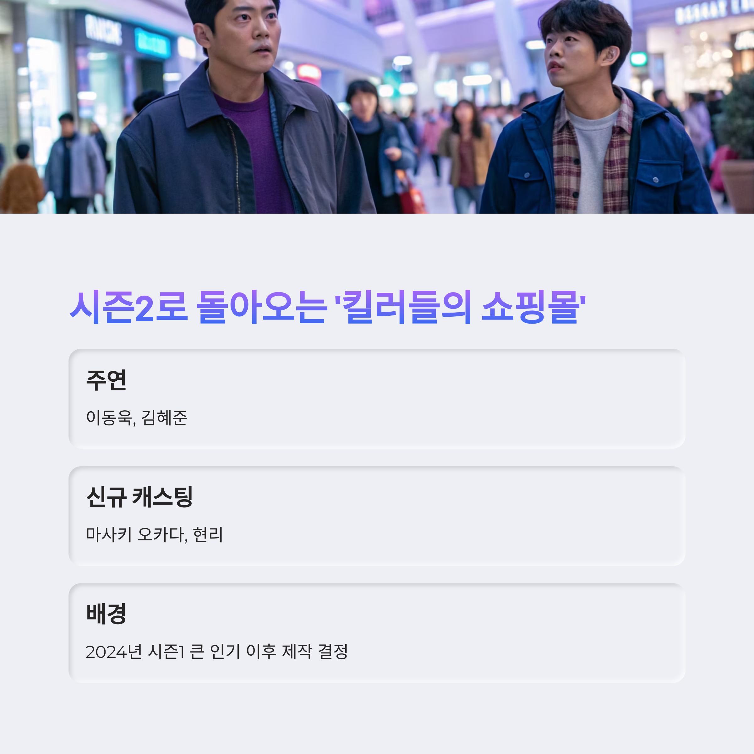 2024년에 큰 인기를 끌었던 '킬러들의 쇼핑몰'이 시즌2로 돌아옵니다. 이동욱과 김혜준이 다시 주연을 맡으며, 새로운 캐릭터로 일본 배우 마사키 오카다와 '파친코'의 현리가 합류합니다 .(The Sun)