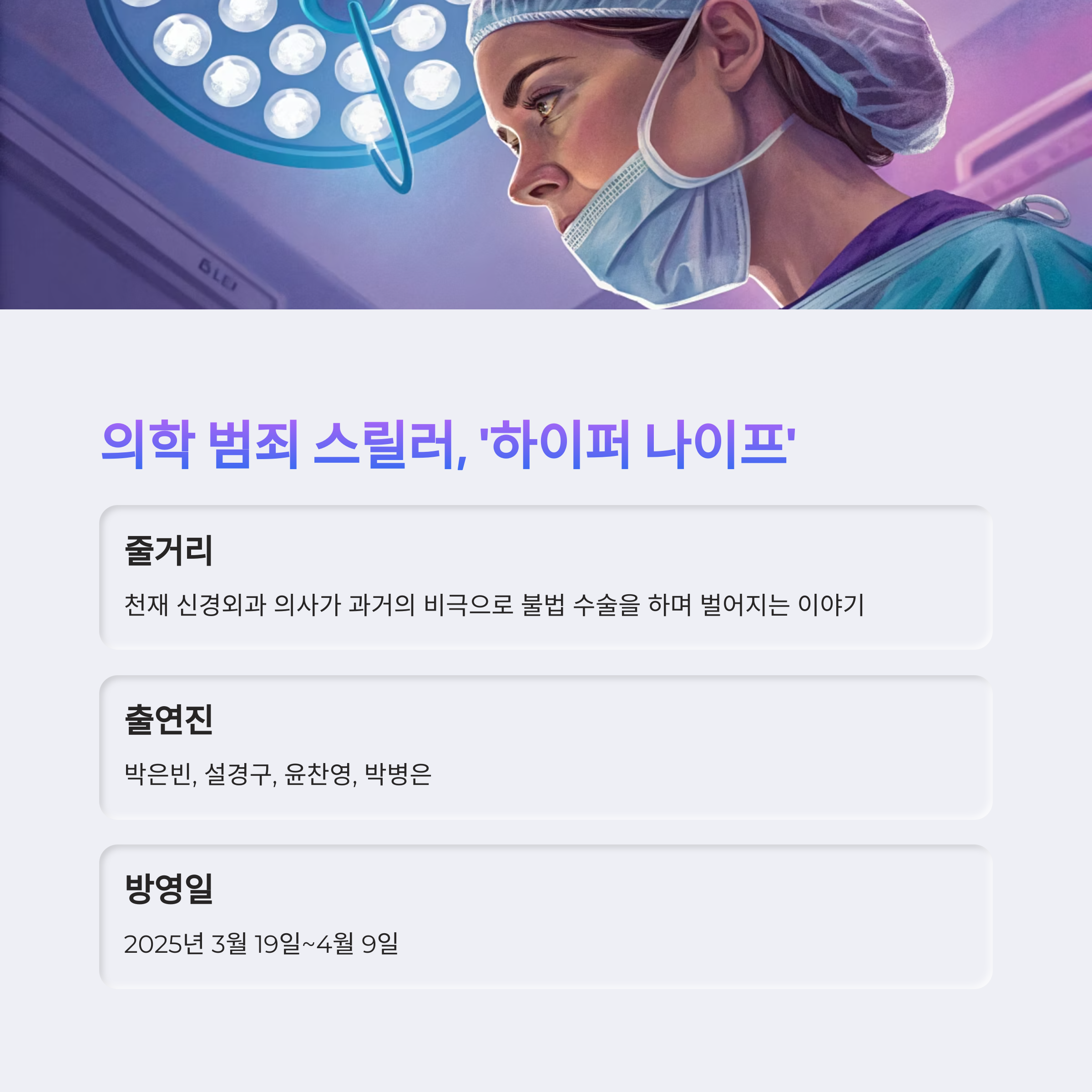 '하이퍼 나이프'는 천재 신경외과 의사 정세옥(박은빈 분)이 과거의 비극으로 인해 불법 수술을 하며 벌어지는 이야기를 그린 의학 범죄 스릴러입니다. 설경구, 윤찬영, 박병은 등이 출연하며, 2025년 3월 19일부터 4월 9일까지 디즈니플러스에서 방영되었습니다 .(위키백과)
