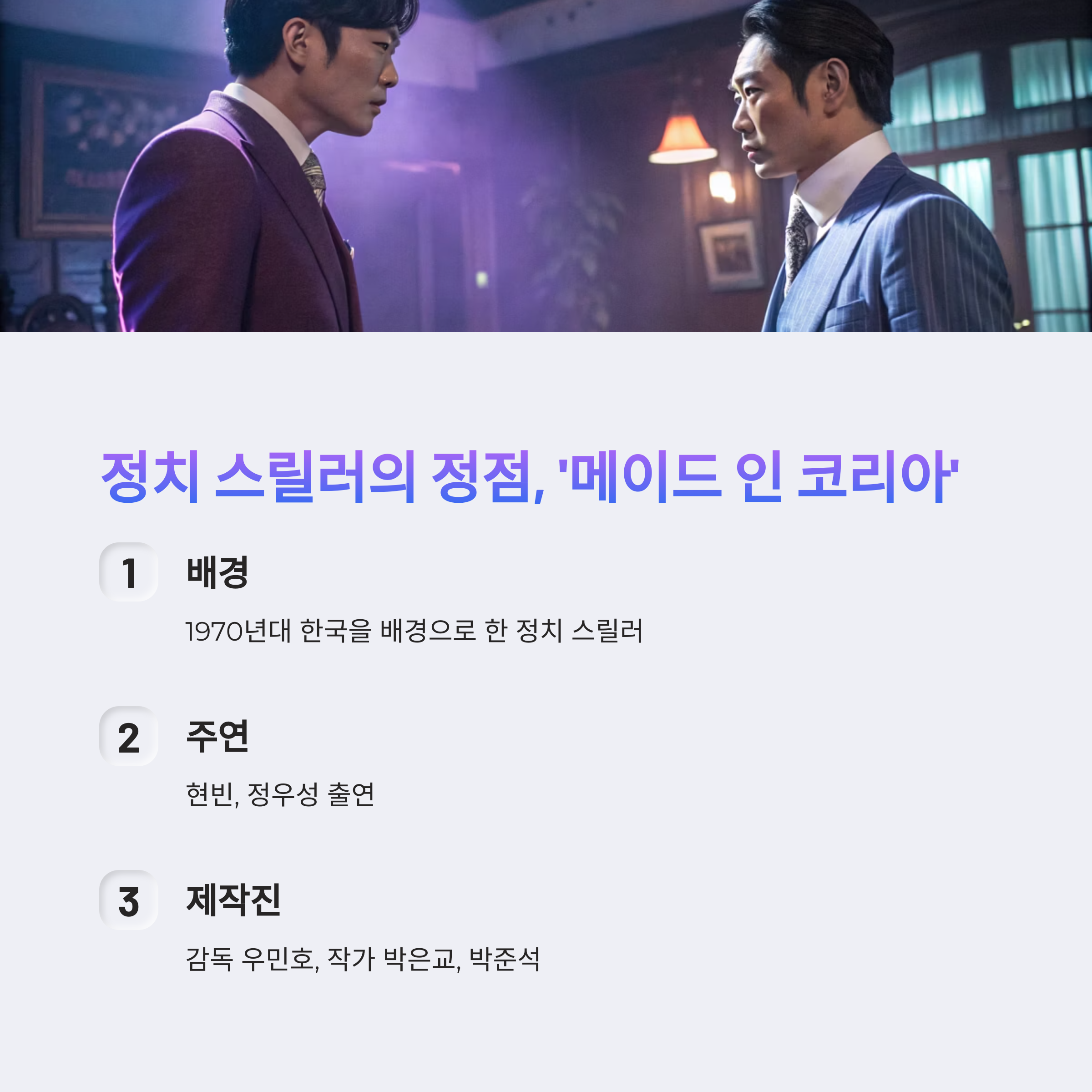 1970년대 한국을 배경으로 한 정치 스릴러 드라마 '메이드 인 코리아'는 현빈과 정우성이 주연을 맡아 권력과 야망의 충돌을 그립니다. 감독 우민호와 작가 박은교, 박준석이 참여하여 기대를 모으고 있습니다. 이 작품은 디즈니플러스에서 독점 공개될 예정입니다 .