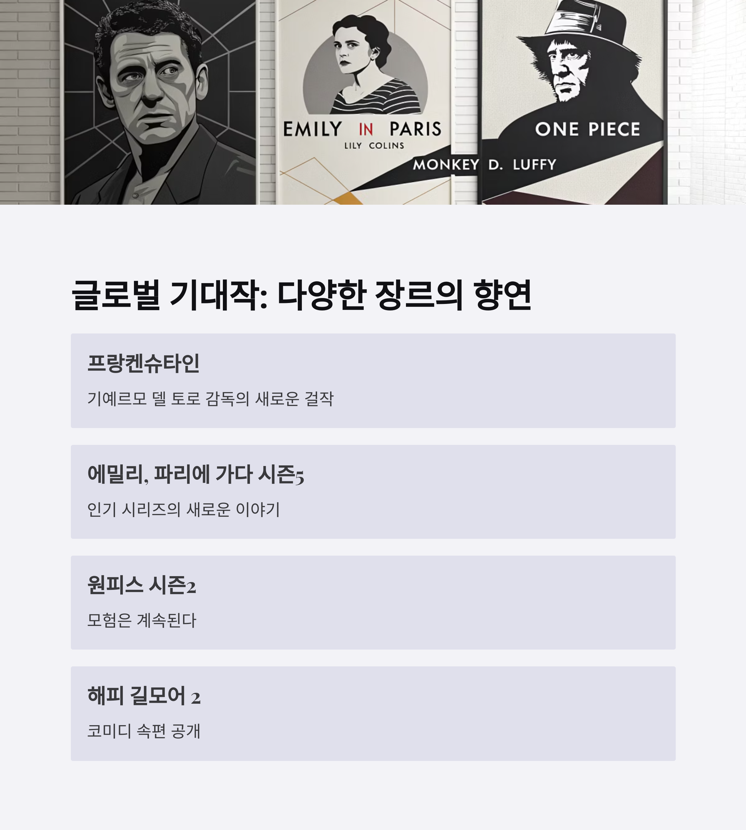 이번 달에는 다양한 장르의 글로벌 신작들이 공개됩니다. 기예르모 델 토로 감독의 '프랑켄슈타인', '에밀리, 파리에 가다' 시즌5, '해피 길모어 2', '원피스' 시즌2 등 다양한 작품들이 시청자를 기다리고 있습니다. (다가 연합뉴스)