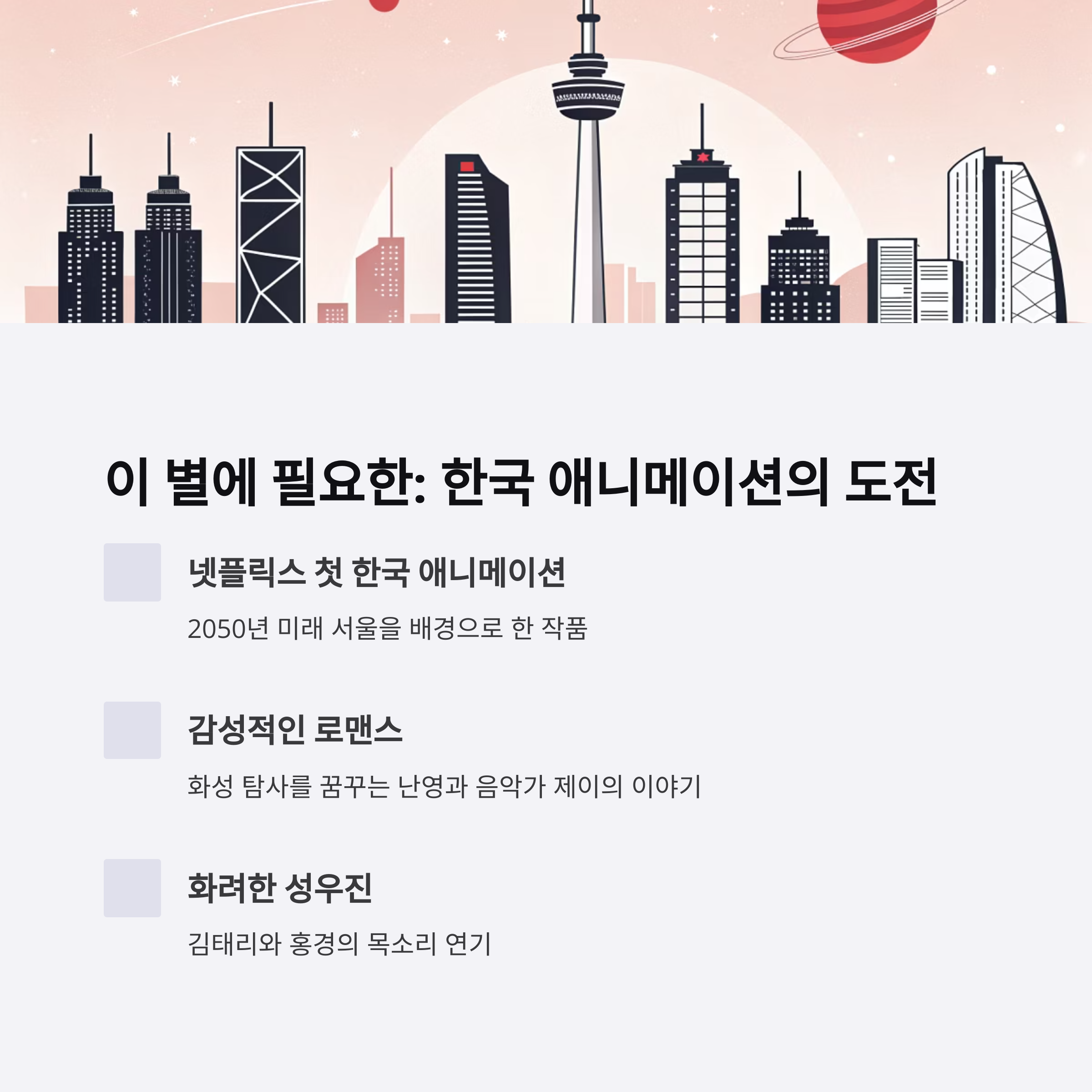 2050년 서울을 배경으로 한 넷플릭스의 첫 한국 애니메이션 영화 '이 별에 필요한'이 5월 30일 공개됩니다. 화성 탐사를 꿈꾸는 우주인 난영과 음악을 포기한 제이의 로맨스를 그린 이 작품은 김태리와 홍경이 목소리 연기를 맡아 감성적인 이야기를 선사합니다.