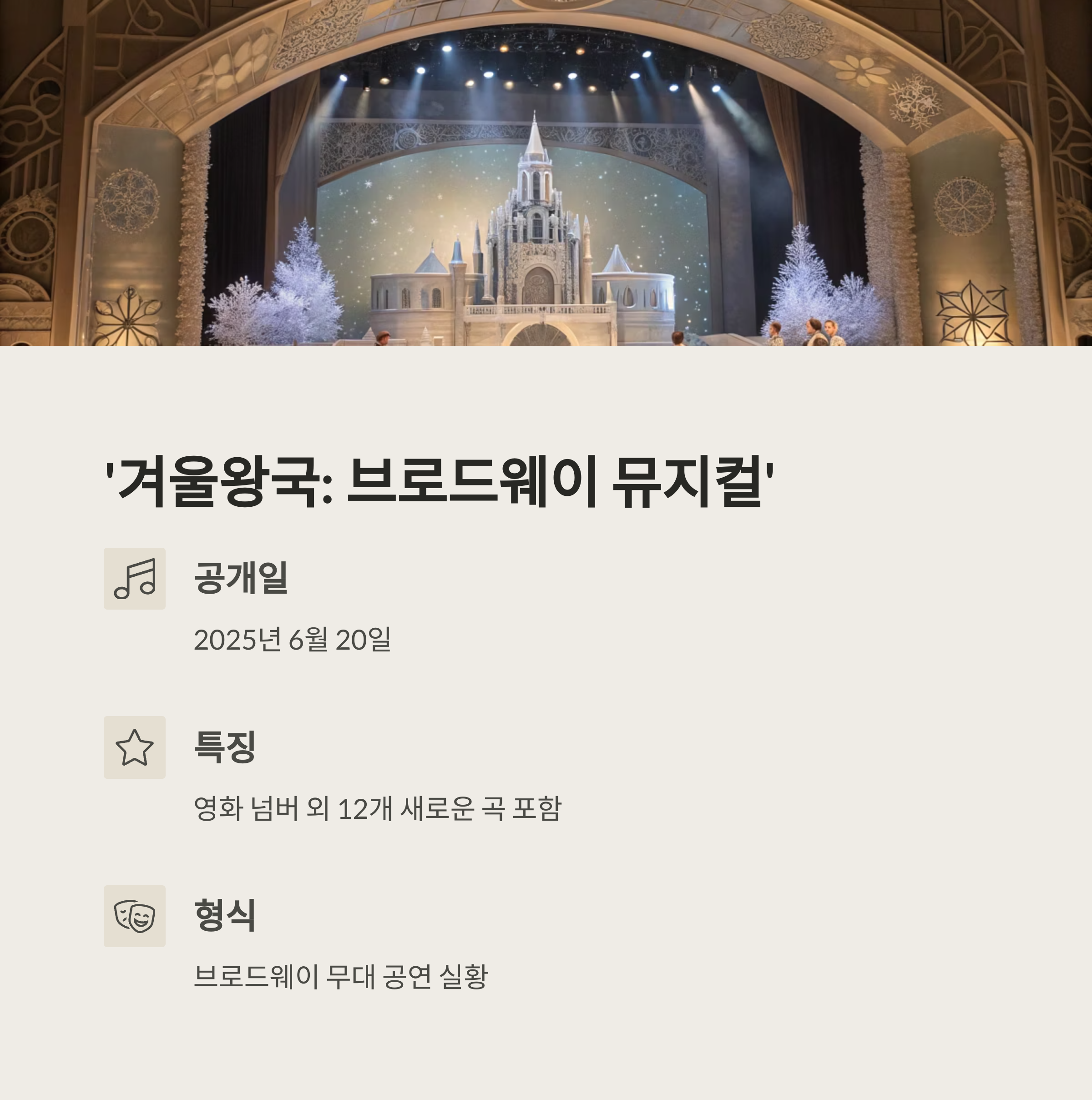 | 겨울왕국: 브로드웨이 뮤지컬 | 6월 20일 | 뮤지컬 공연 |