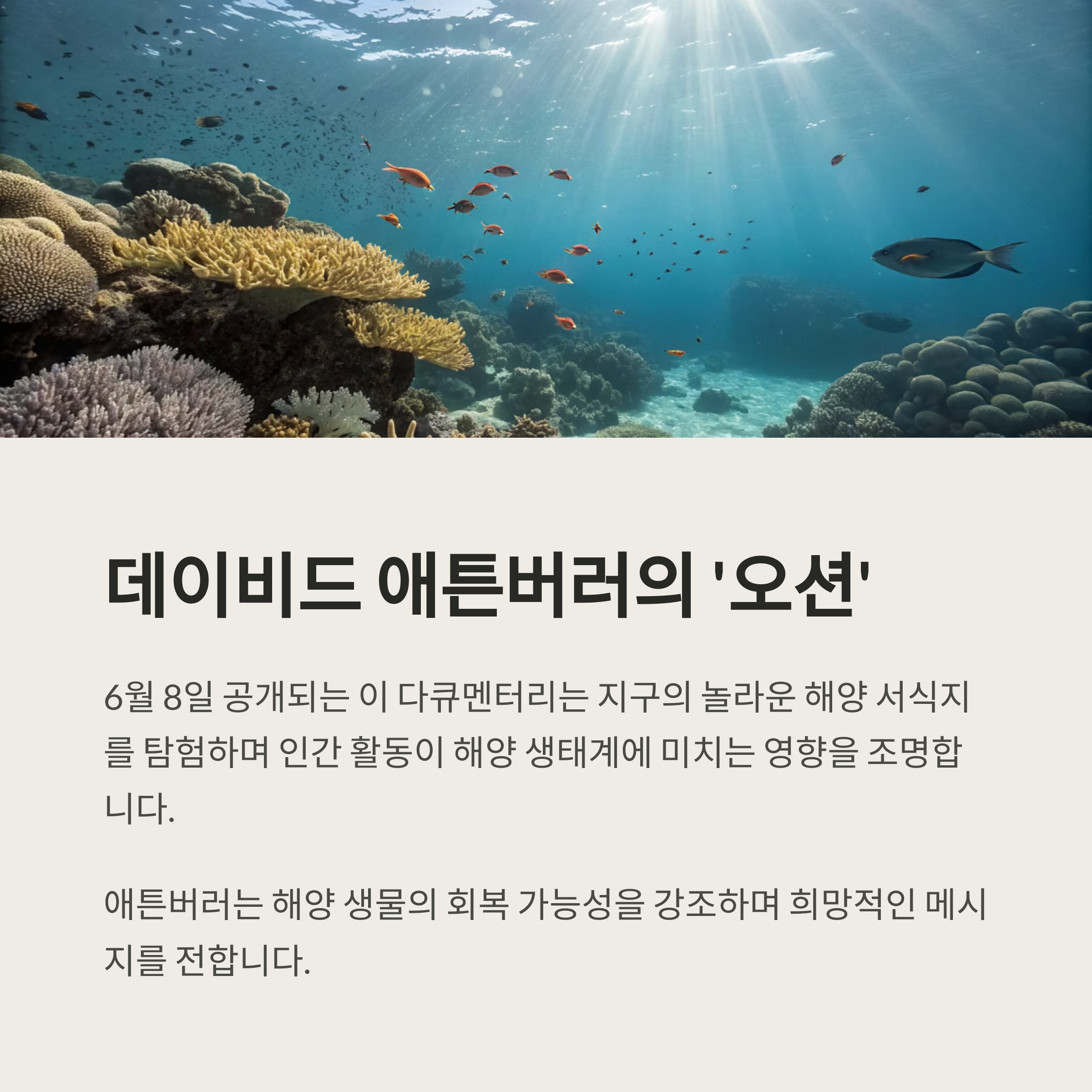 6월 8일, 데이비드 애튼버러의 새로운 다큐멘터리 '오션'이 공개됩니다. 이 작품은 지구의 가장 놀라운 해양 서식지를 탐험하며, 인간 활동이 해양 생태계에 미치는 영향을 조명합니다. 그는 희망적인 메시지를 전하며 해양 생물의 회복 가능성을 강조합니다 .(Disney Plus Press)