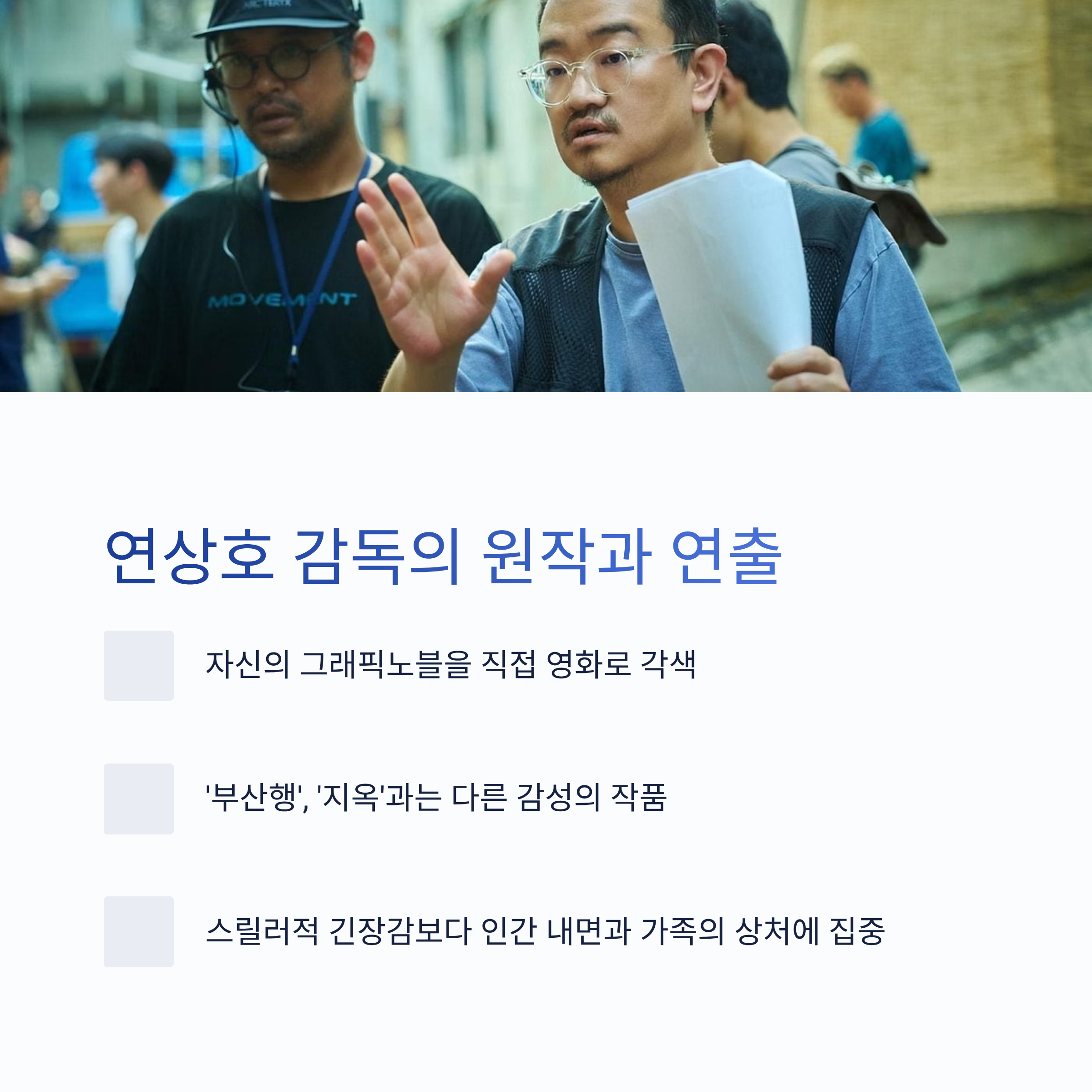 연상호 감독은 그래픽노블을 직접 영화로 옮겨오며 원작의 디테일과 감정을 영화적 언어로 다시 해석했습니다. 부산행, 지옥 등을 통해 장르적 색깔과 서사를 동시에 구축해온 그는 이번에는 스릴러적 긴장감보다 인간의 내면과 가족의 상처를 깊이 탐구하는 방향을 택했습니다.
