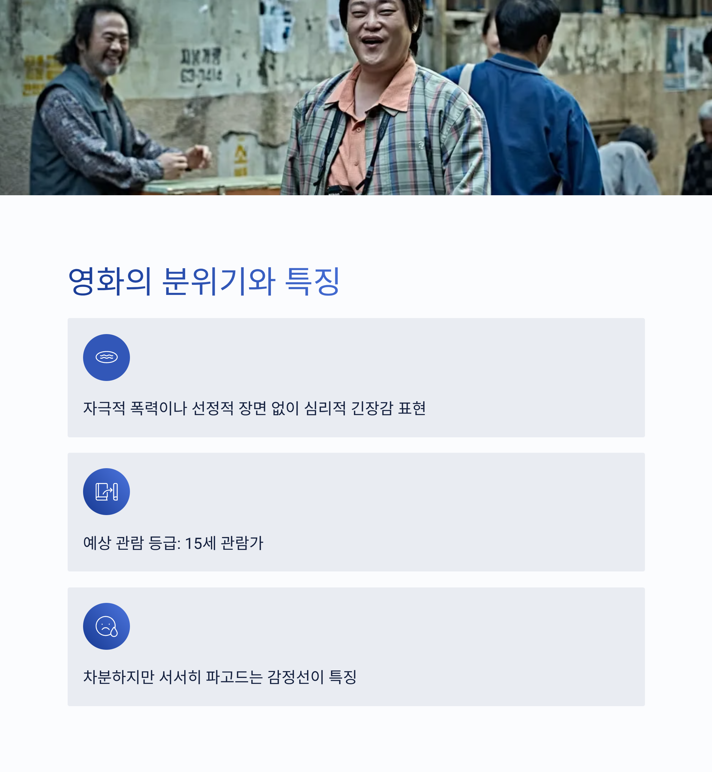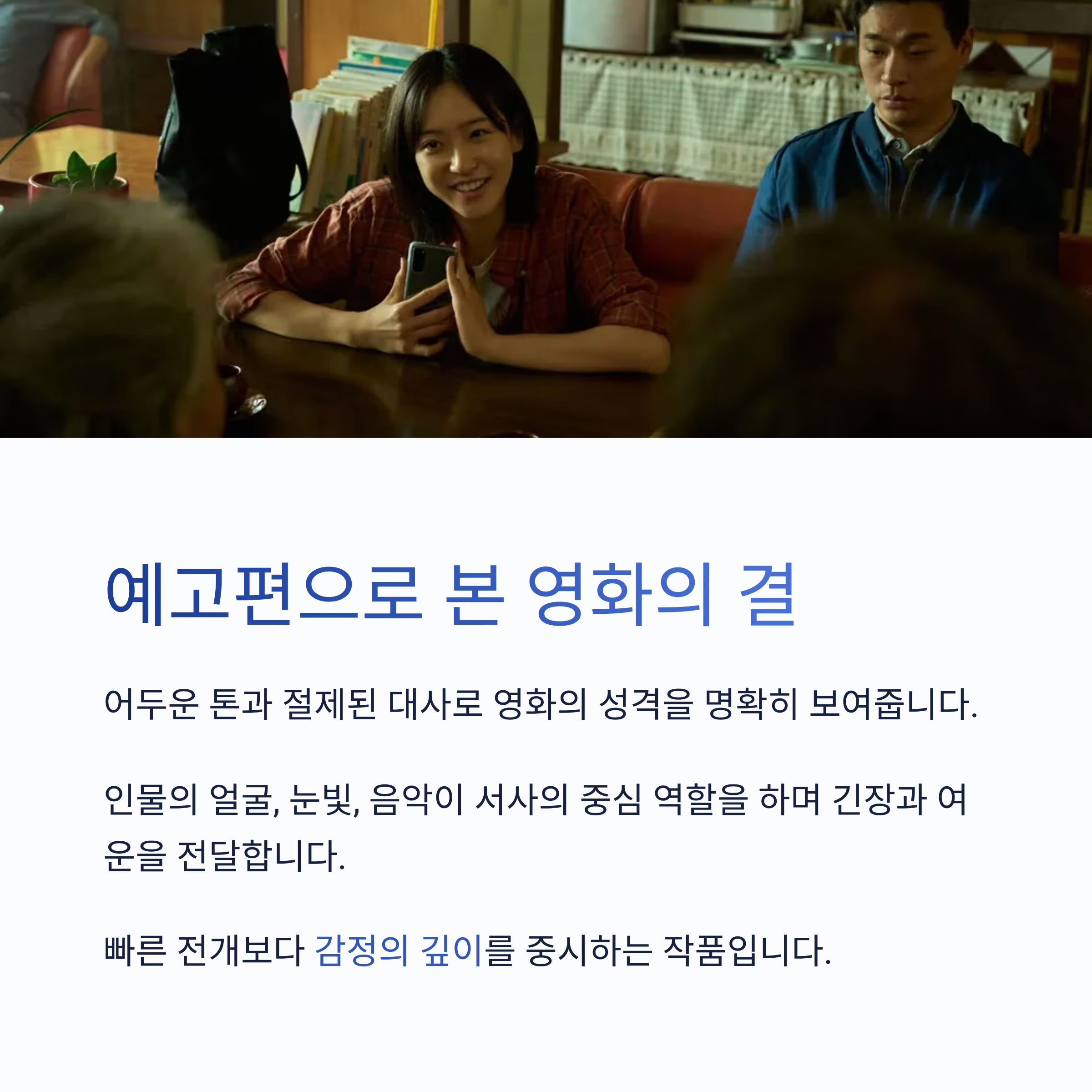 공개된 예고편은 어두운 톤과 절제된 대사로 이 영화의 성격을 명확히 보여줍니다. 인물의 얼굴, 눈빛, 그리고 음악이 곧 서사의 중심 역할을 하며 관객에게 긴장과 여운을 동시에 전달합니다. 빠른 전개보다 감정의 깊이를 중시하는 작품임을 짐작할 수 있습니다.