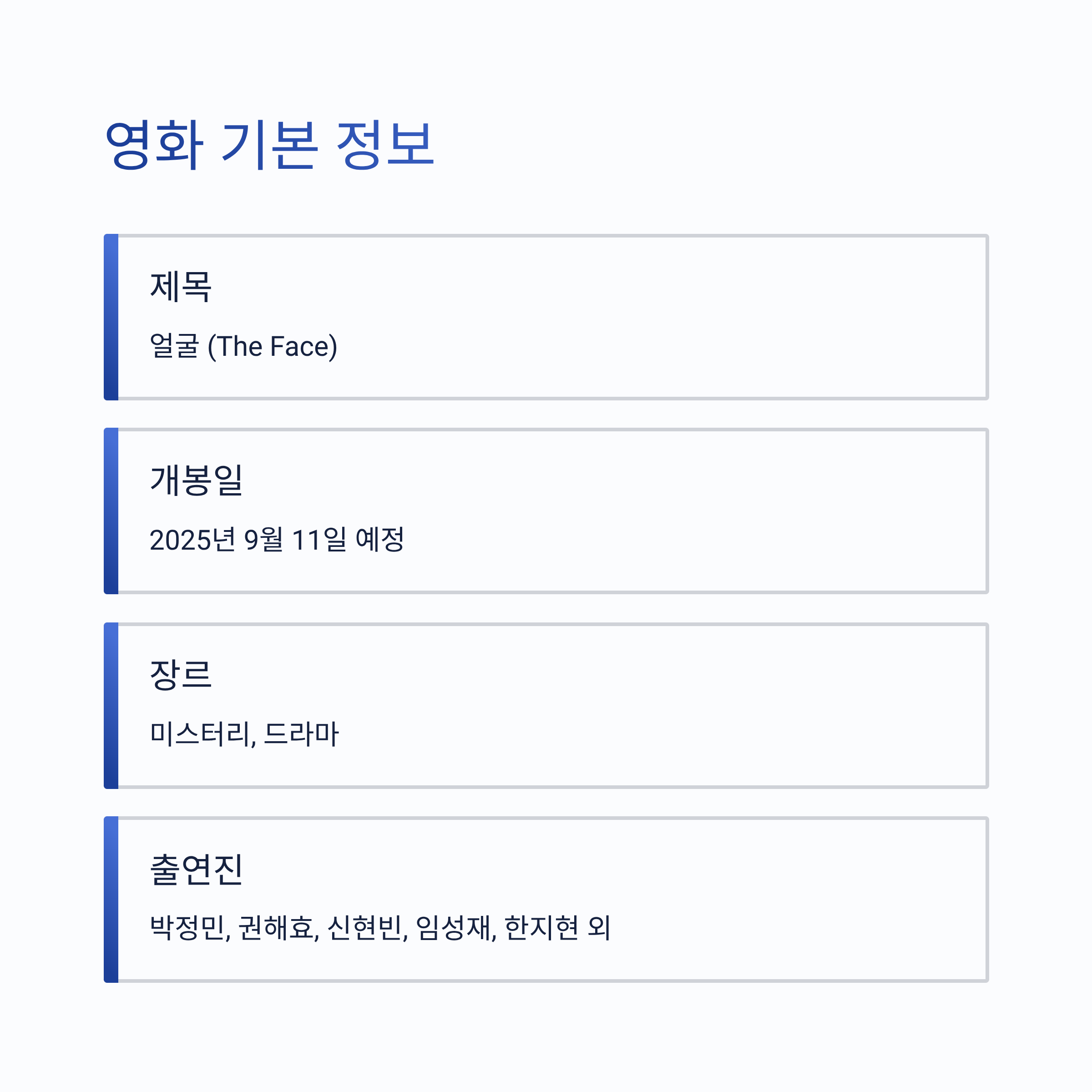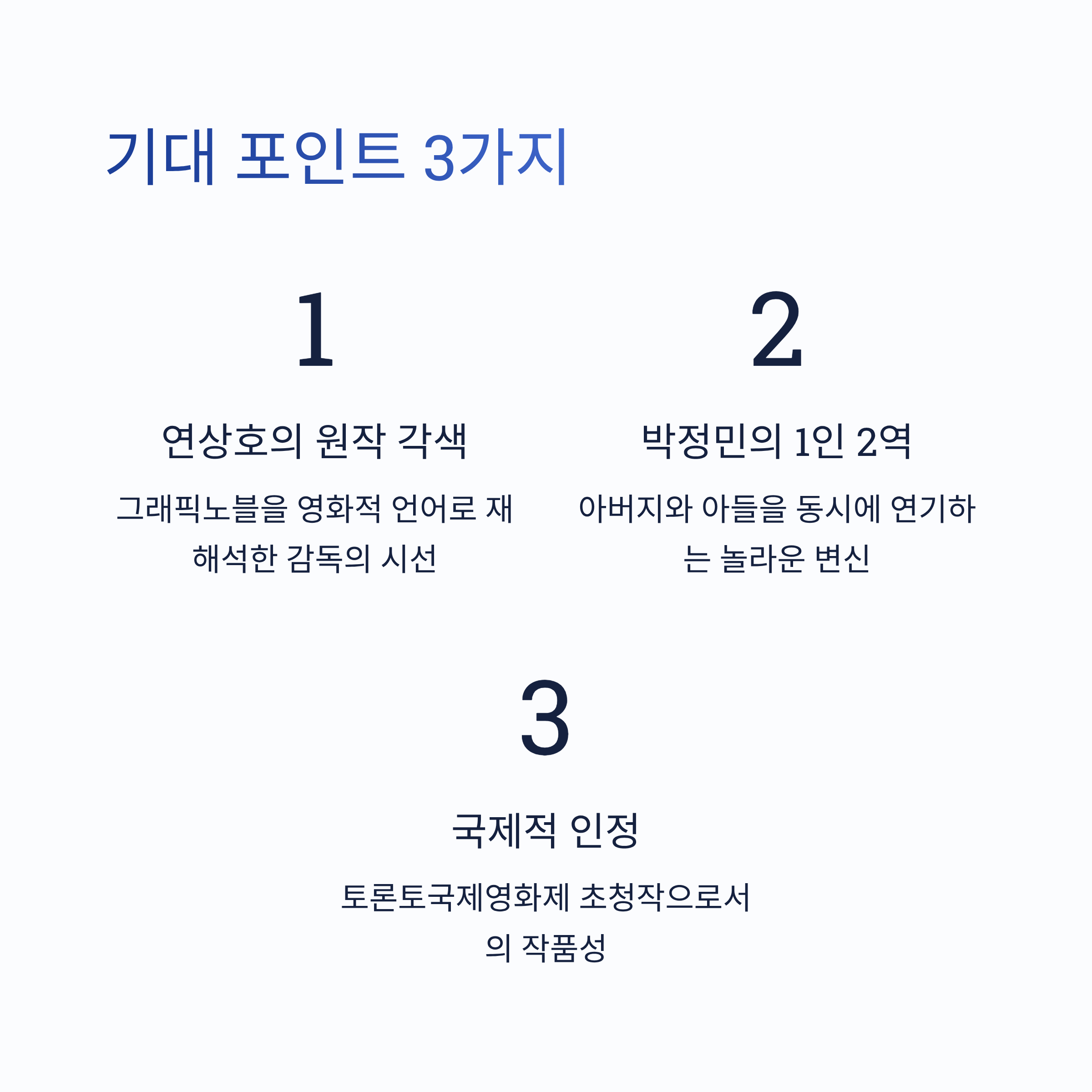 올가을 개봉을 앞둔 영화 얼굴은 연상호 감독의 동명 그래픽노블을 원작으로 한 미스터리 드라마입니다. 이미 토론토국제영화제에 초청되며 작품성을 인정받았고, 박정민 배우가 아버지와 아들을 동시에 연기하는 1인 2역으로 주목받고 있습니다. 사건 그 자체보다는 감정과 기억, 가족의 이야기에 집중한 작품이라 묵직한 여운을 남길 것으로 기대됩니다.