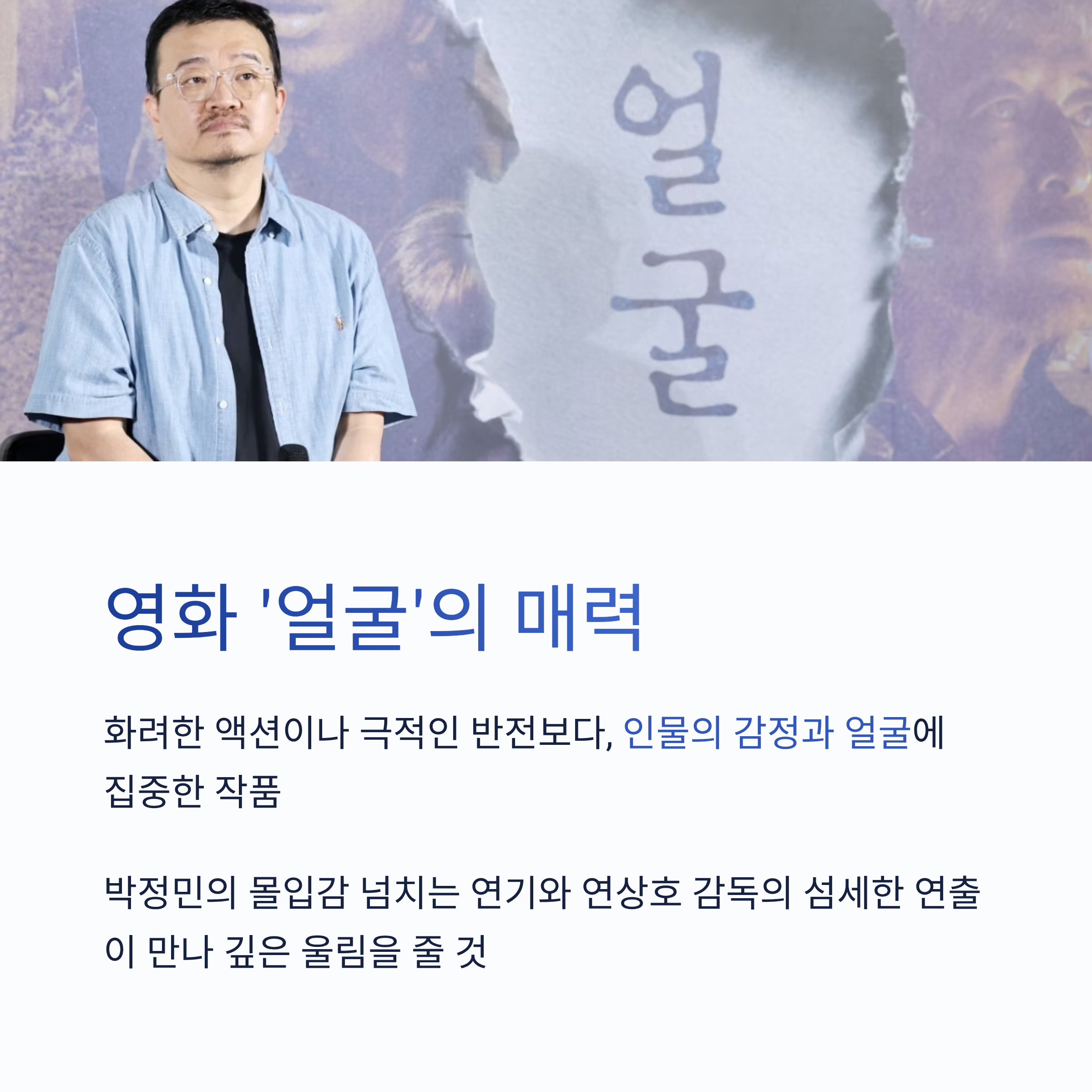 얼굴은 화려한 액션이나 극적인 반전보다, 인물의 감정과 얼굴에 집중한 작품입니다. 박정민 배우의 몰입감 넘치는 1인 2역과 연상호 감독의 섬세한 연출이 만나 관객에게 깊은 울림을 줄 것으로 보입니다. 개봉일이 가까워질수록 더 큰 관심을 모을 이 작품은, 2025년 하반기 가장 주목받는 한국 영화 중 하나가 될 것입니다.